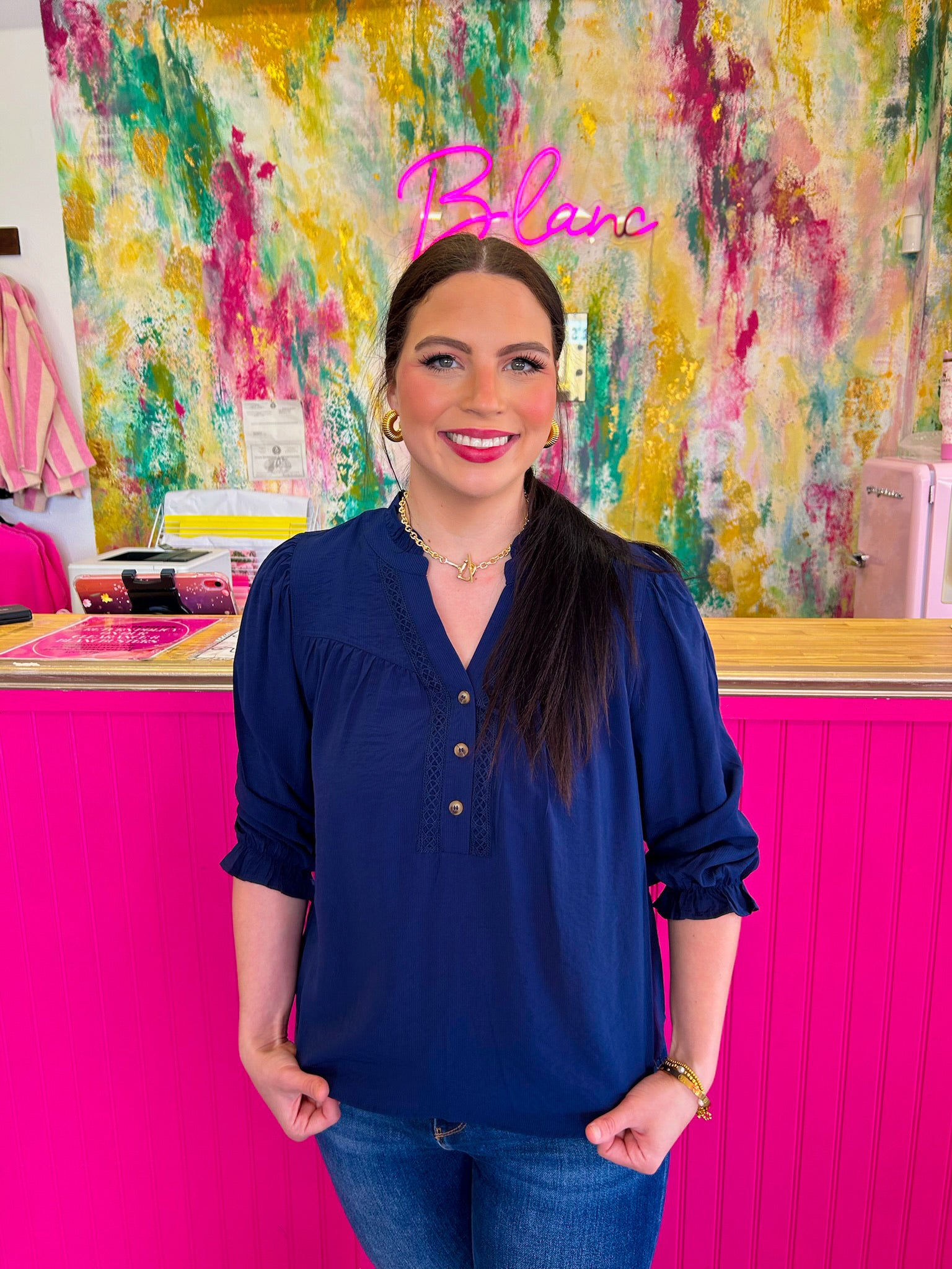 Looking for a blouse that feels feminine without being fussy? The Sophia Blouse brings soft texture and subtle detail together in an easy, everyday silhouette. The ruffle trim, crochet lace accents, and half button-down front add just enough charm while still keeping the look clean and versatile.