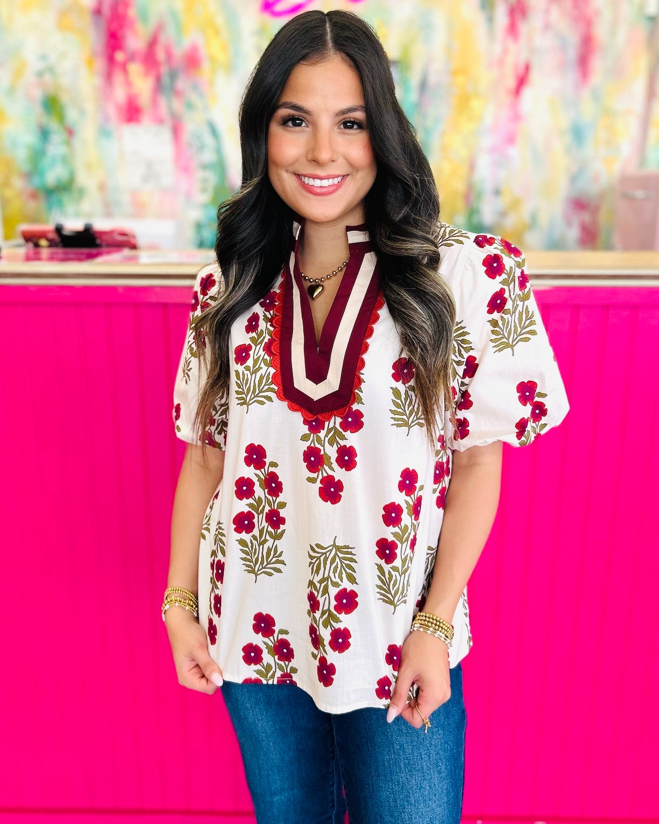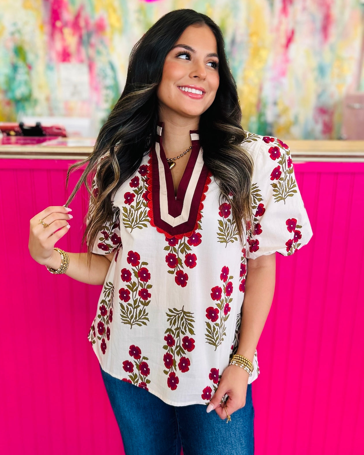 This beautiful top captures a bohemian elegance with its detailed print and charming accents. The centerpiece is the high mandarin-style collar and deep V-neck keyhole placket, which are framed by thick cream-colored piping and an intricate scalloped ruffle trim in a deep burgundy hue. Finished with light, subtly puffed short sleeves, this top offers a relaxed yet tailored fit, making it perfect for pairing with denim or flowing skirts for an effortlessly stylish look. By Entro.