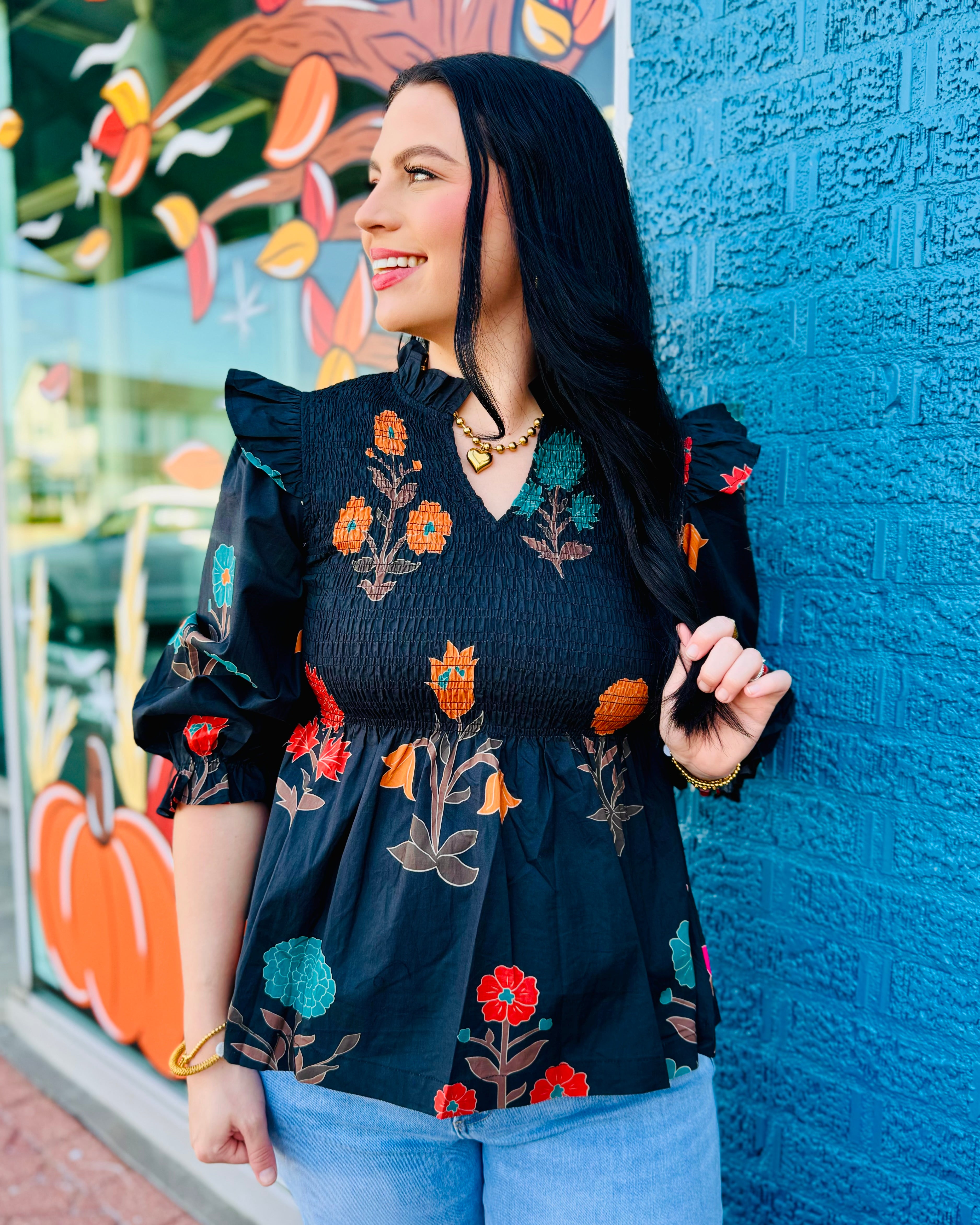 This lightweight woven top showcases a botanical print with 3/4 sleeves, a smocked bodice, and delicate ruffle accents on the shoulders. The sleeves are finished with elastic cuffs for a comfy fit. Unlined and non-sheer, it offers both style and comfort.