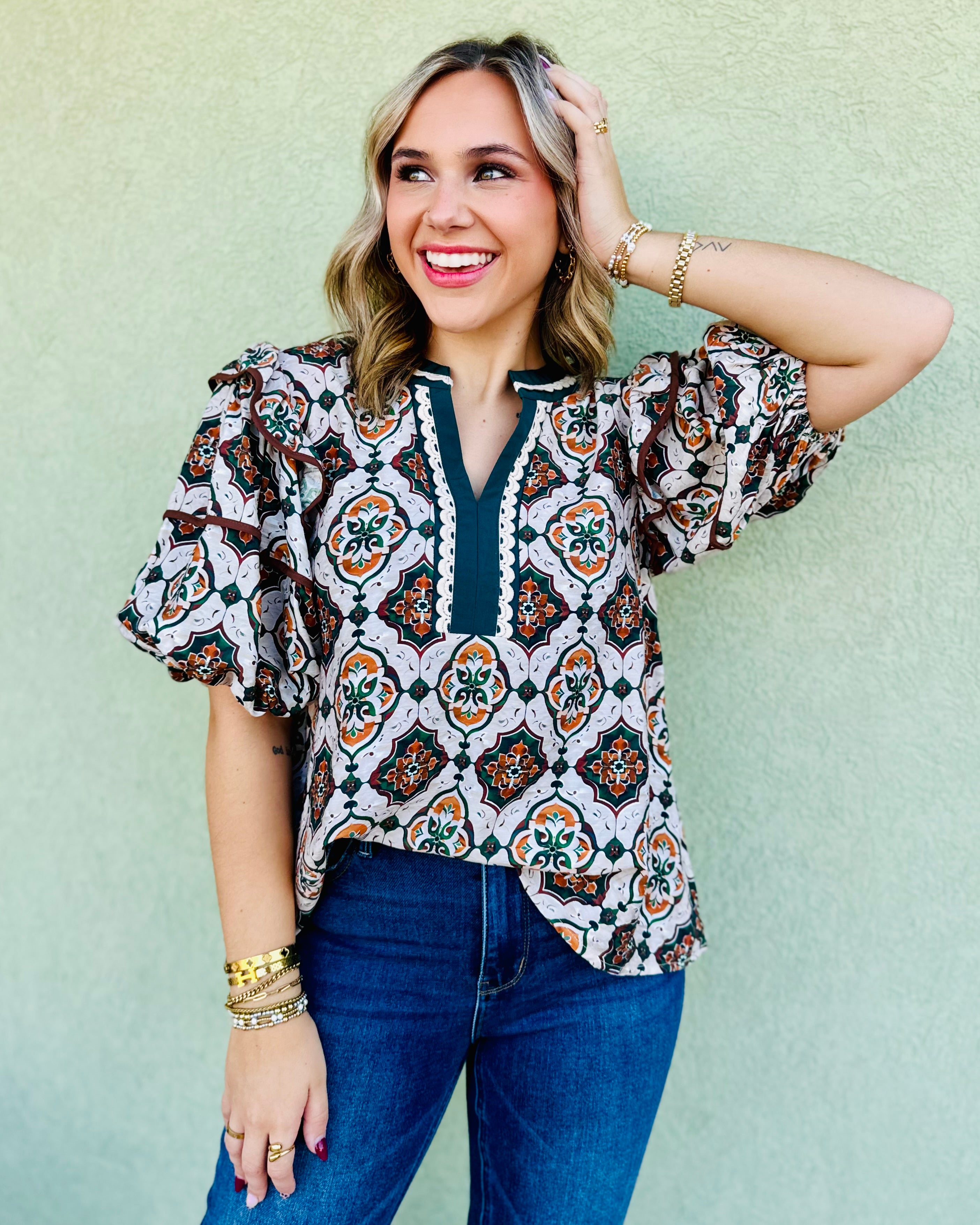 This blouse showcases an intricate geometric print, features a high, split V-neckline enhanced by a wide dark green velvet placket and a delicate scalloped crochet trim. The comfortable, voluminous silhouette is complemented by fashionable 3/4 length balloon sleeves with subtle ruffled cuffs. Perfect for elevating your wardrobe with a sophisticated bohemian touch, this top offers both style and ease for everyday wear.