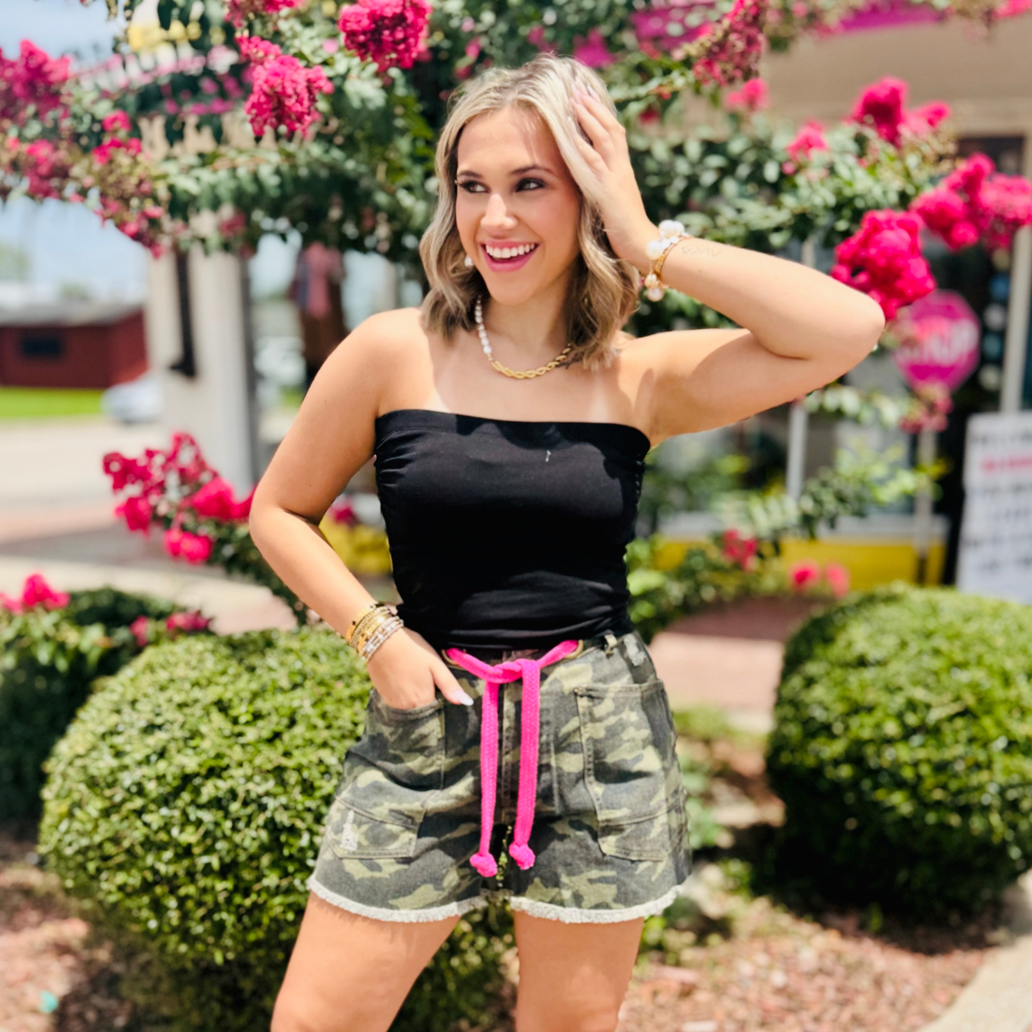 Camouflage print shorts with patch pockets and a hot pink braided belt