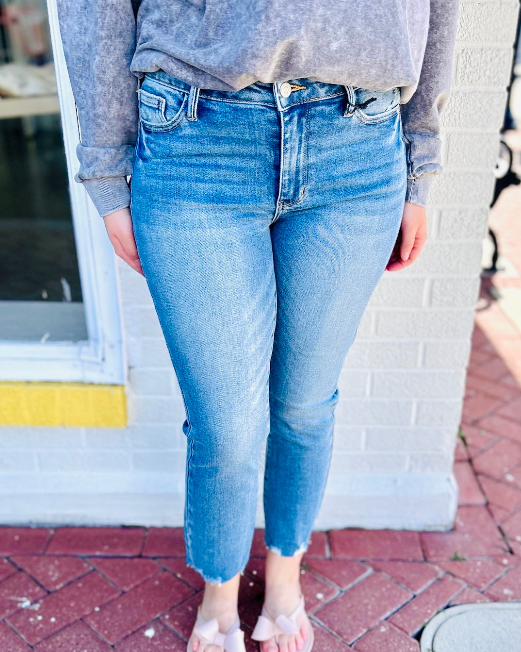 Discover the flattering medium-rise fit of the Veda jeans, featuring a vintage wash and intentionally distressed hem for a bold, stylish look. These kick flare jeans by Judy Blue blend classic charm with edgy details to elevate your wardrobe effortlessly.