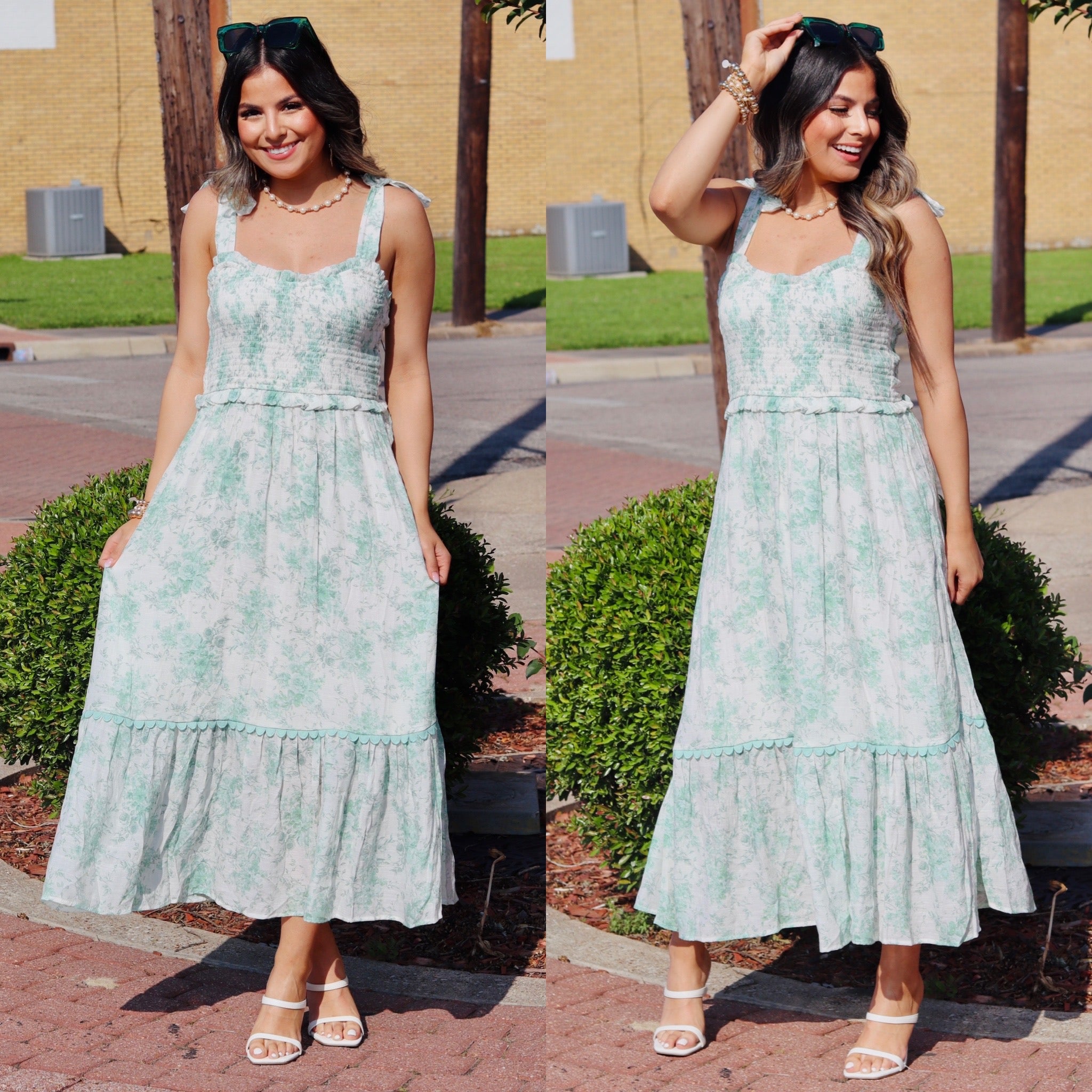 Floral smocked sweetheart ruffle trim midi dress with tie strap shoulders