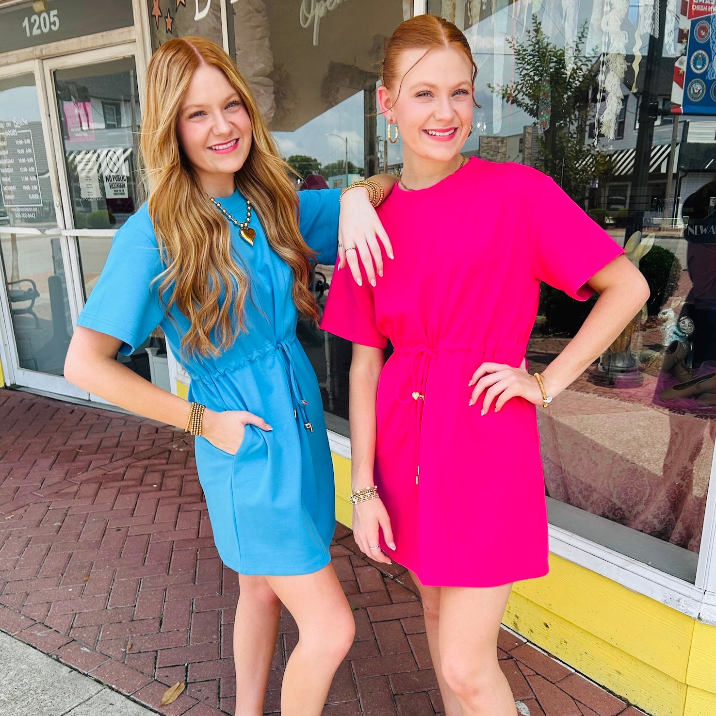Solid round neck short sleeve mini dress featuring adjustable drawstring at waist. Pocket at sides. Unlined. Knit. Non-sheer. Lightweight. By Entro!