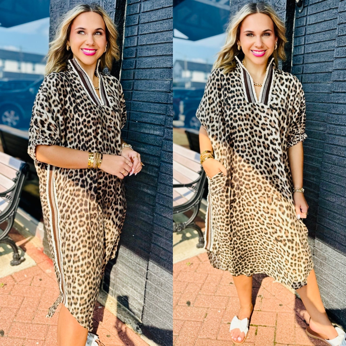 Turn heads in this statement midi! The leopard print gets a chic twist with lace-edged, multicolor rib band detail at the split neckline. Finished with ¾ dolman sleeves and side pockets, this woven style is lined, lightweight, and easy to wear all day.