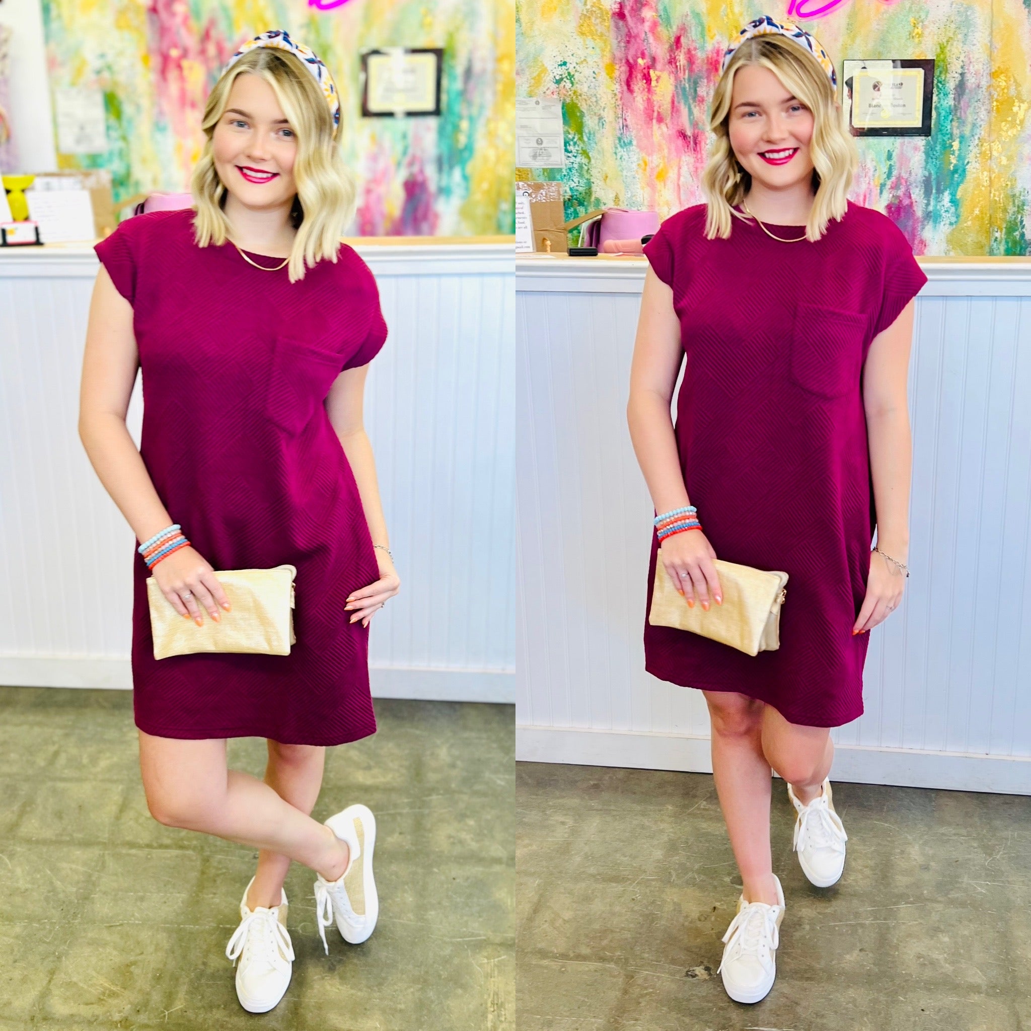 Textured round neck sleeveless mini dress featuring single pocket at bust. Pockets at side. Unlined. Knit. Non-sheer. Lightweight. By Entro!
