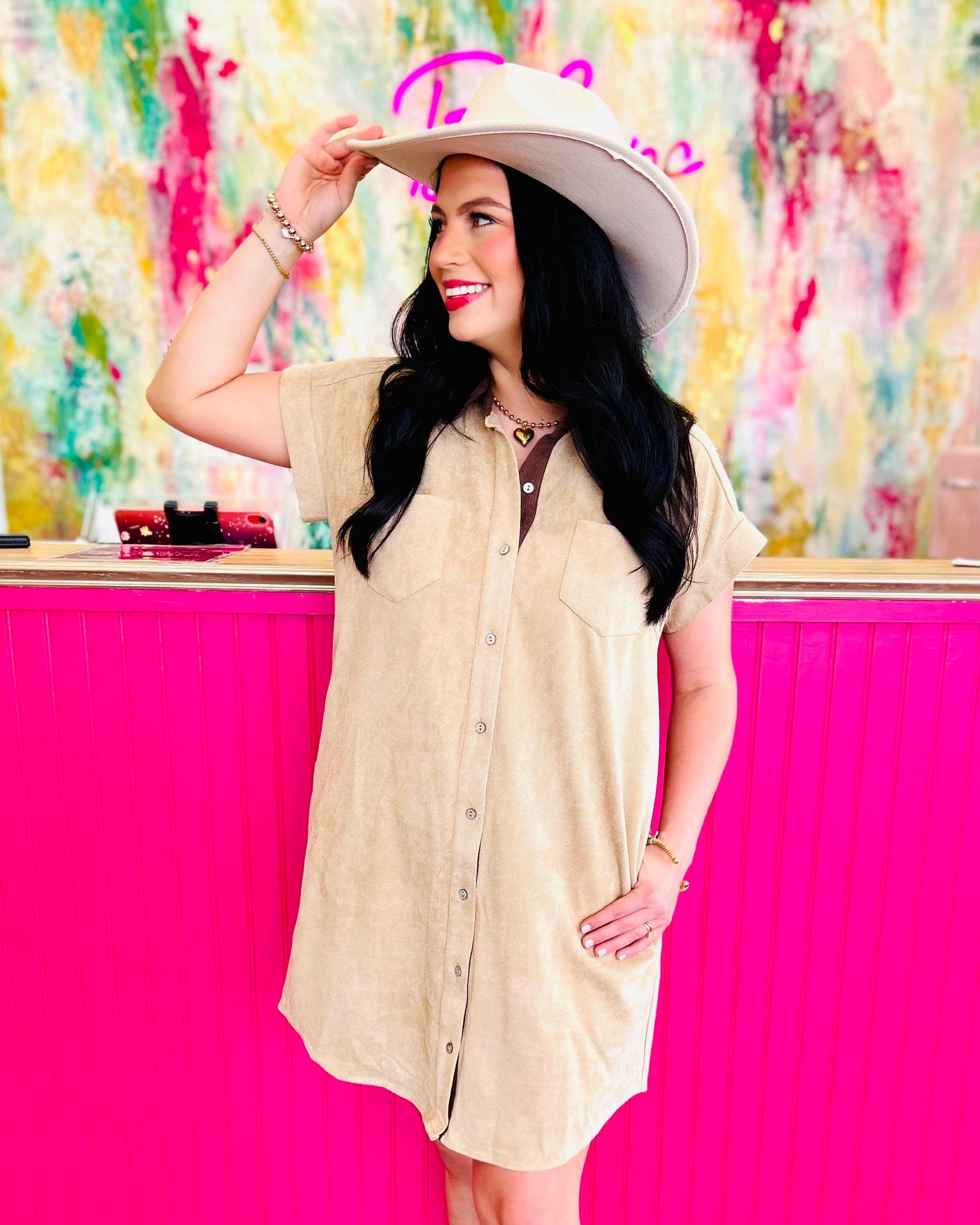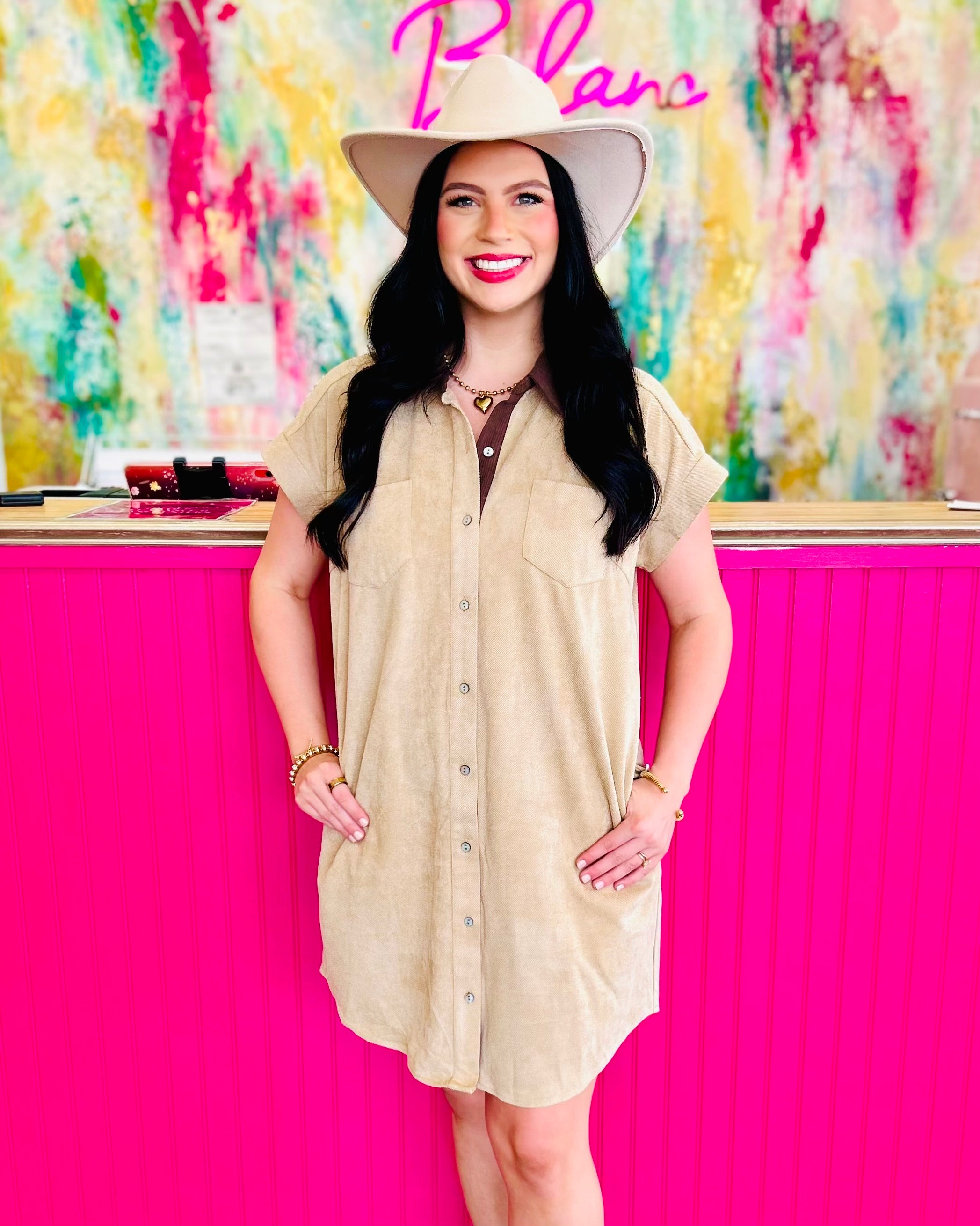 This short sleeve mini shirt dress features a button-down front and is crafted from twill suede with a contrasting collar and pockets. Made by She + Sky, it combines 92% polyester and 8% spandex for a comfortable, flattering fit.