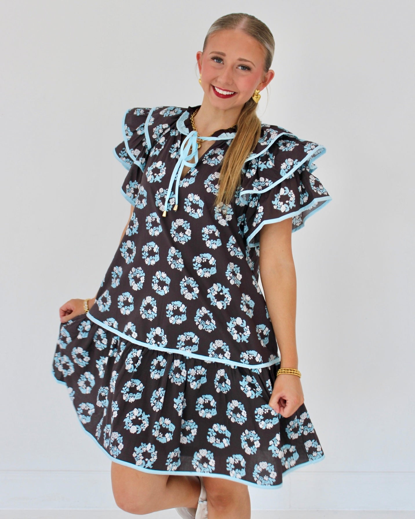 This lightweight woven mini dress features a floral print with contrasting accents, tiered ruffle sleeves, and a ruffle hem. Designed for comfort and style, it includes side pockets and a lining, ensuring it is non-sheer. Crafted from 100% cotton by Entro, it’s perfect for a fresh, feminine look.