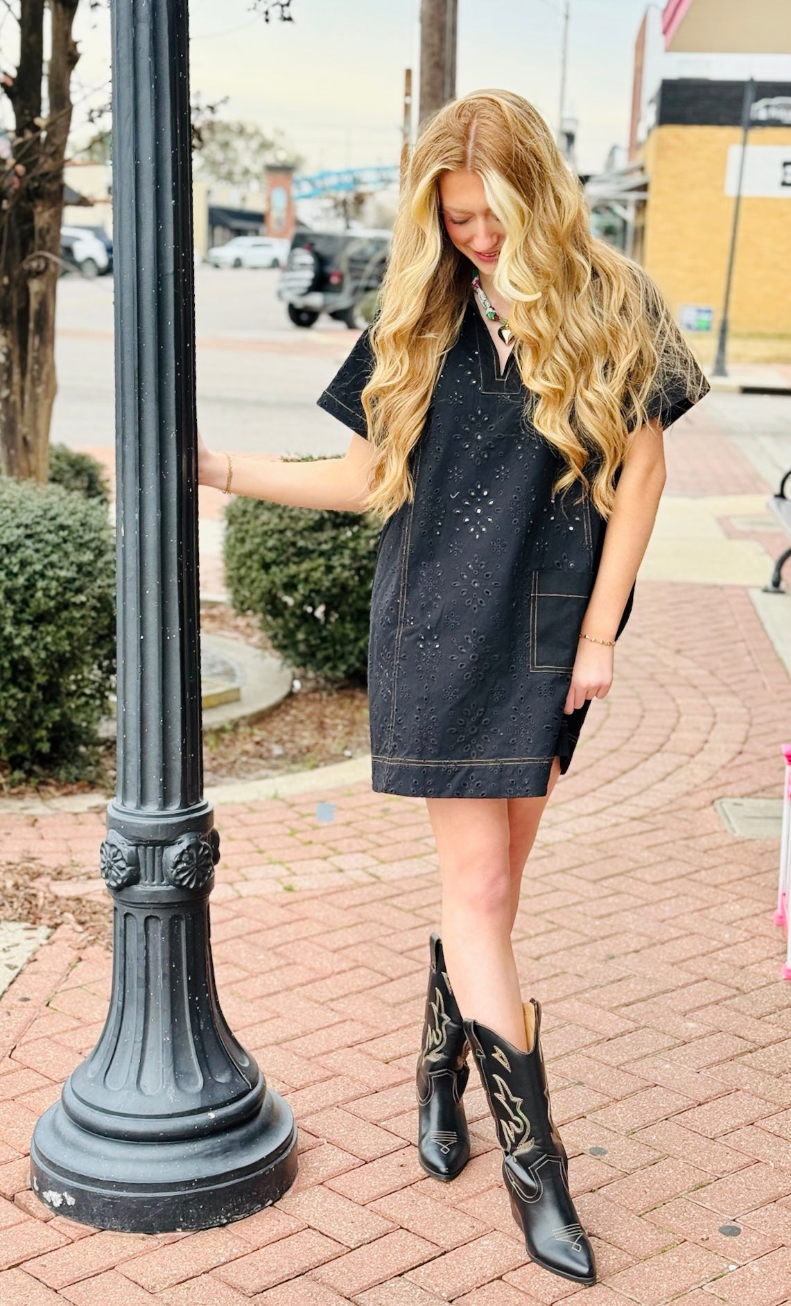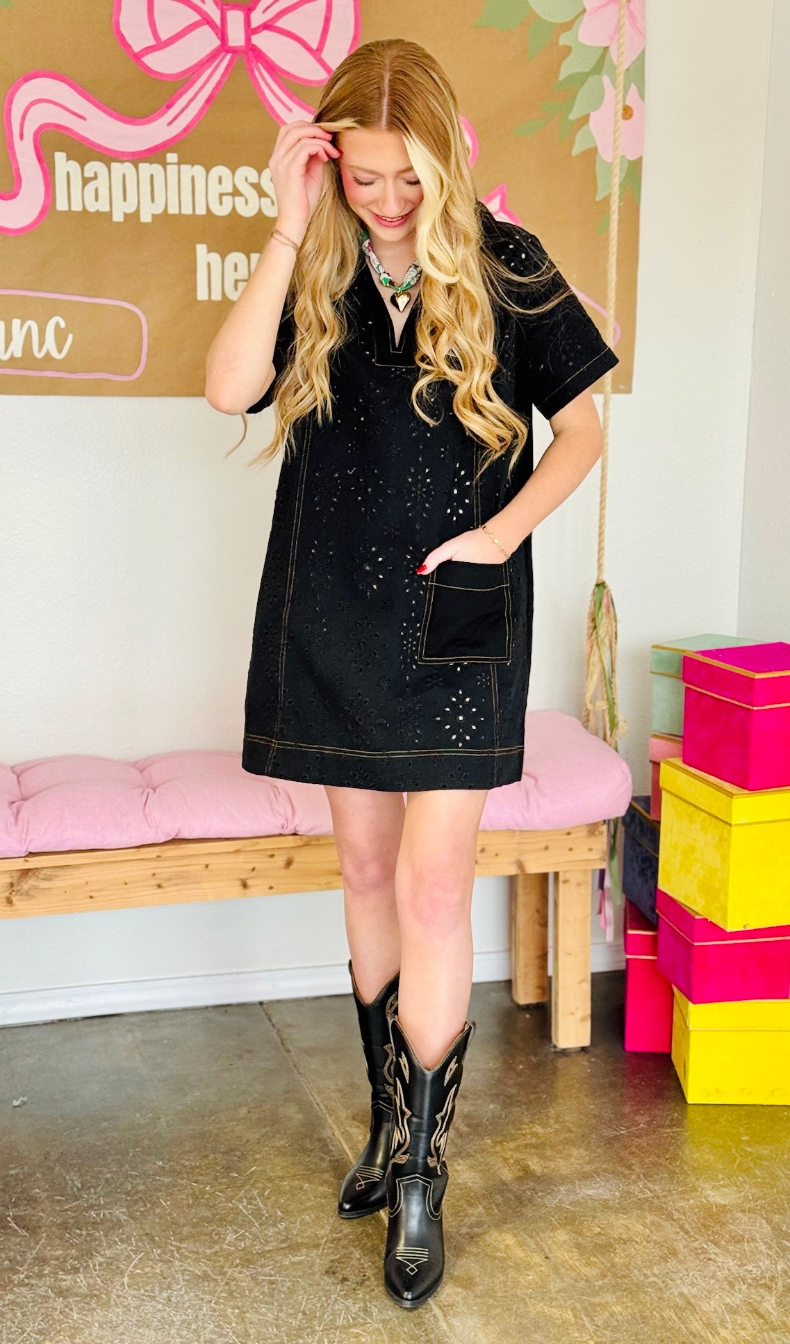 Bring timeless charm to your wardrobe with this airy eyelet shift dress. Short sleeves and a mini length make it perfect for everyday wear or weekend outings.