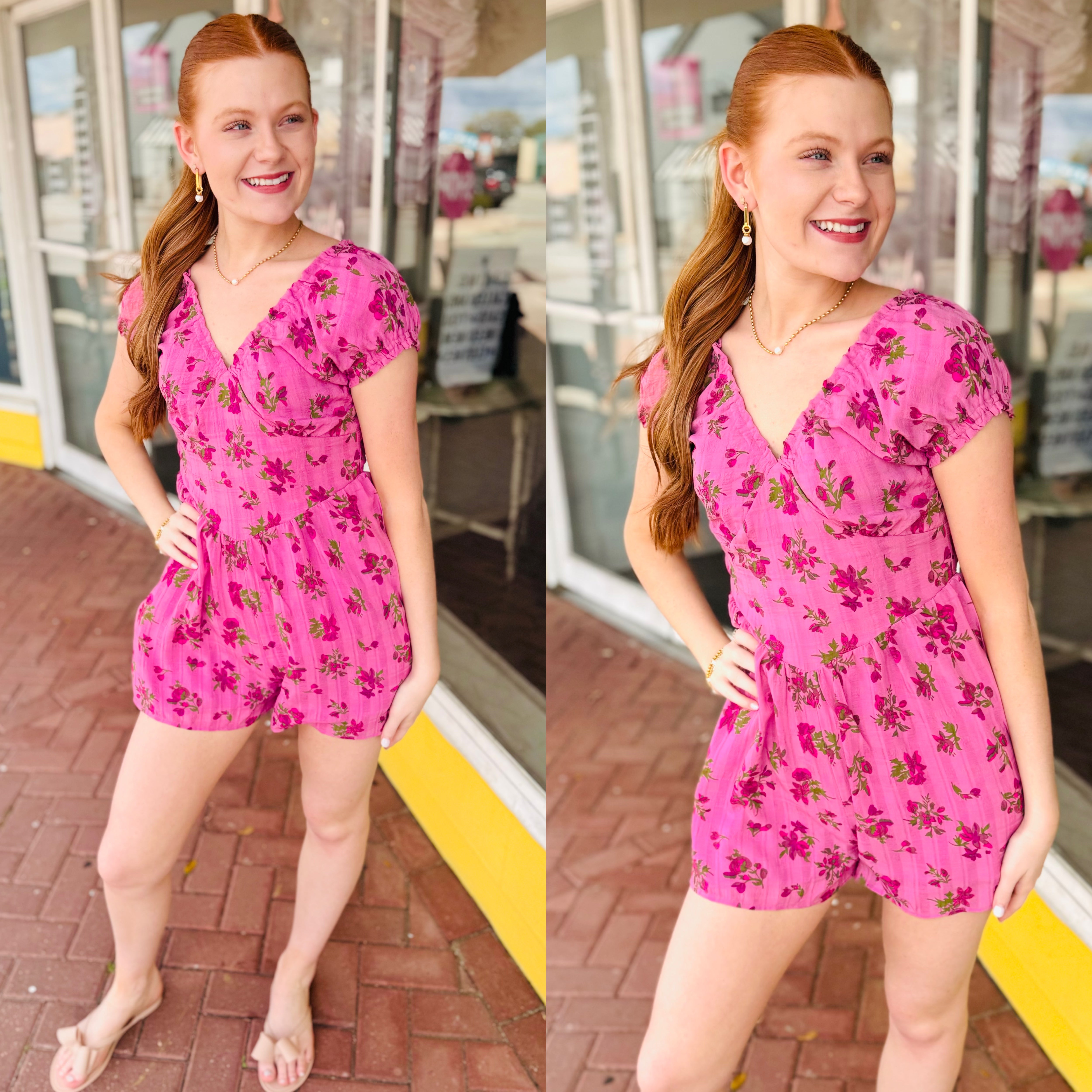 Floral printed ruffle romper with a deep v-neck, short sleeves, elastic waistband, and back zipper.