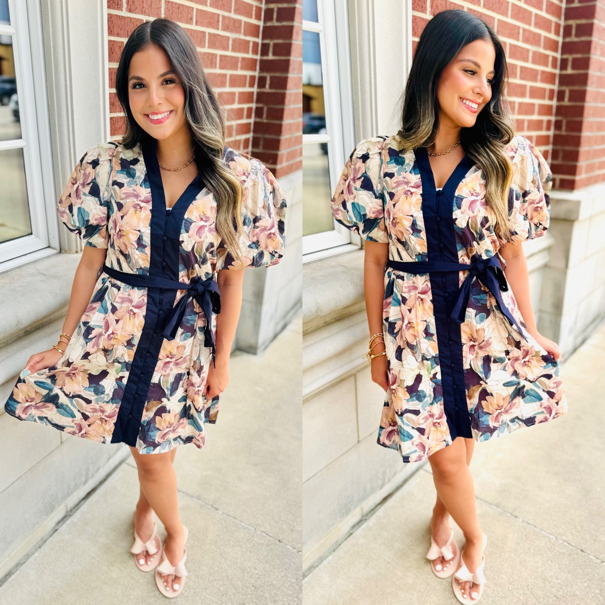 Floral print cuff band ¾ sleeve ruffle hem mini dress. Contrast striped accent hem and button closure at front. Pockets at sides. Lined. Woven. Non-sheer. Lightweight. By Entro!