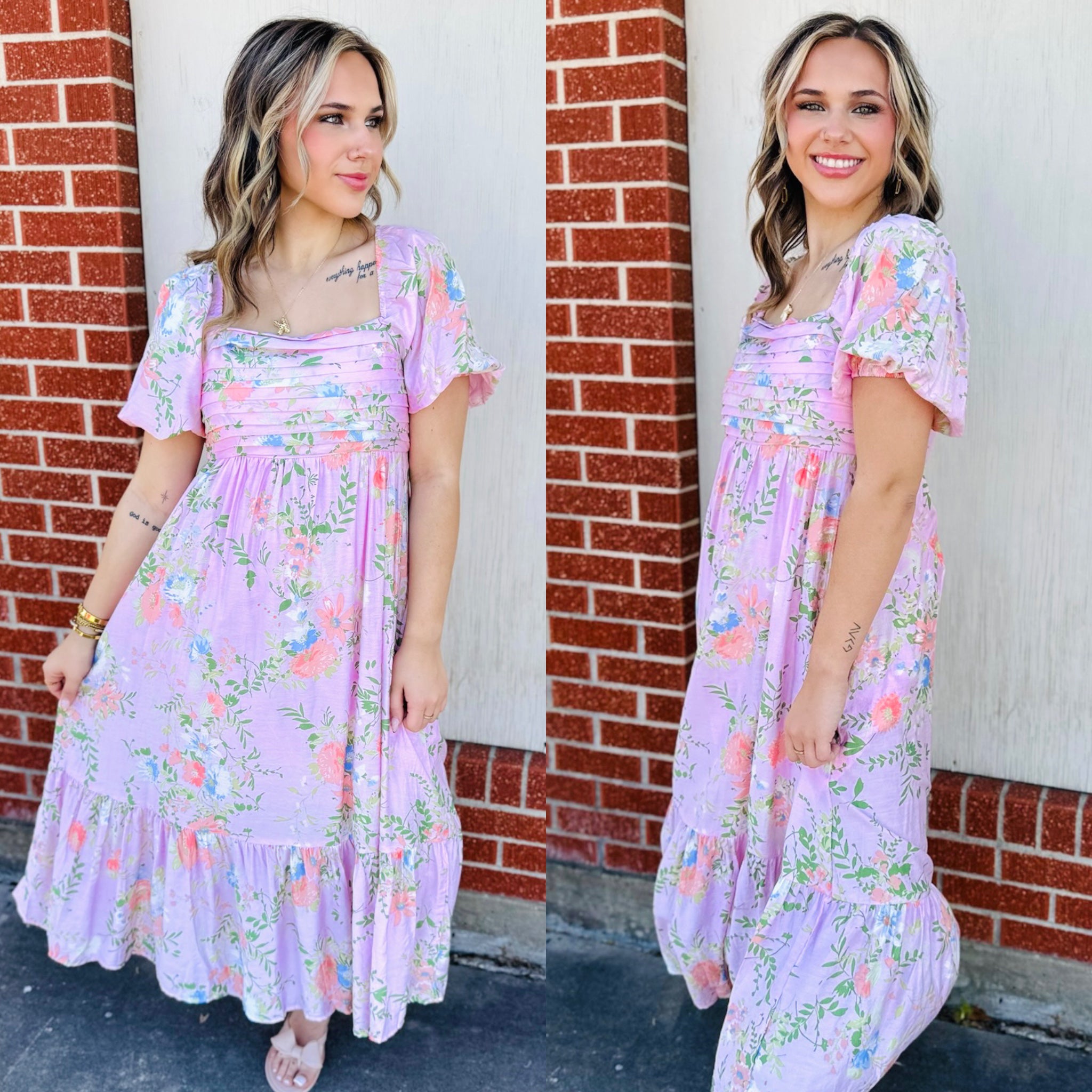 Floral pleated front balloon sleeve midi dress