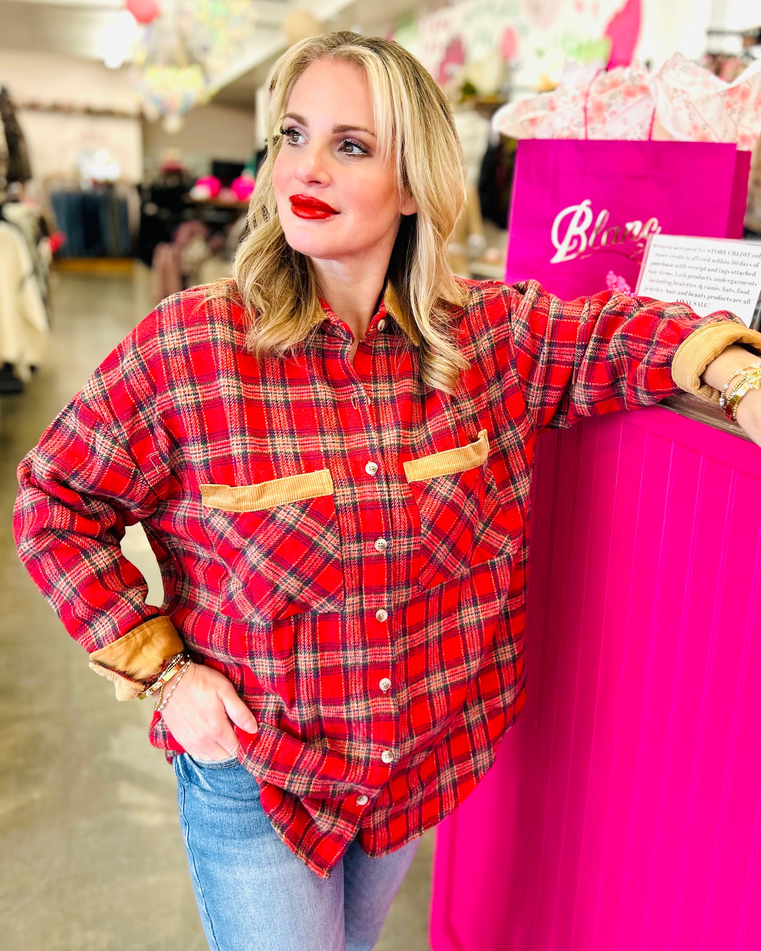This long-sleeve button-down plaid shacket features a contrasting collar and a convenient front pocket, crafted from 100% polyester by She + Sky. Perfect for layering, it combines style and comfort effortlessly.