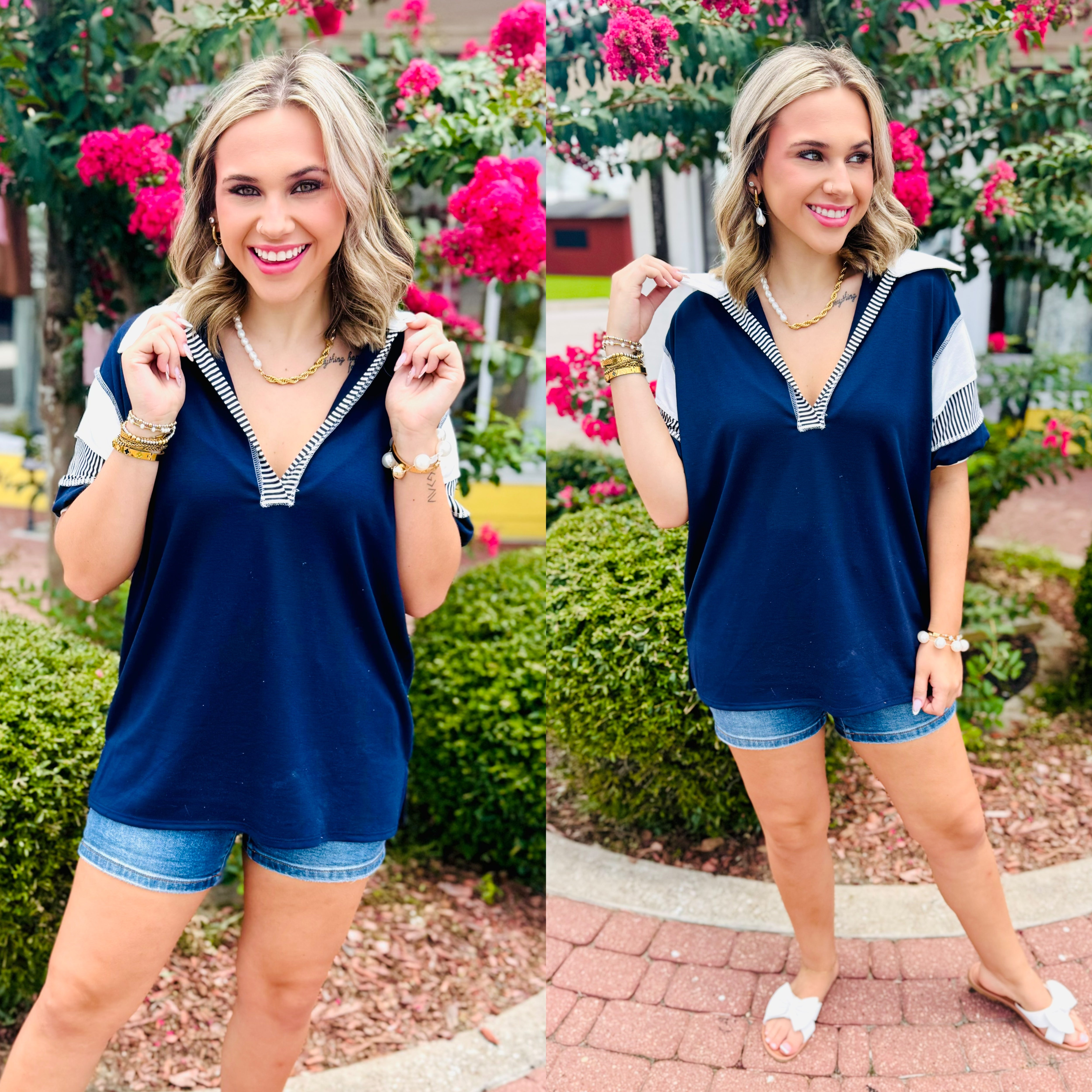 Colorblocked top featuring a collar neckline, V-neck, drop shoulders, stripes, and short sleeves.