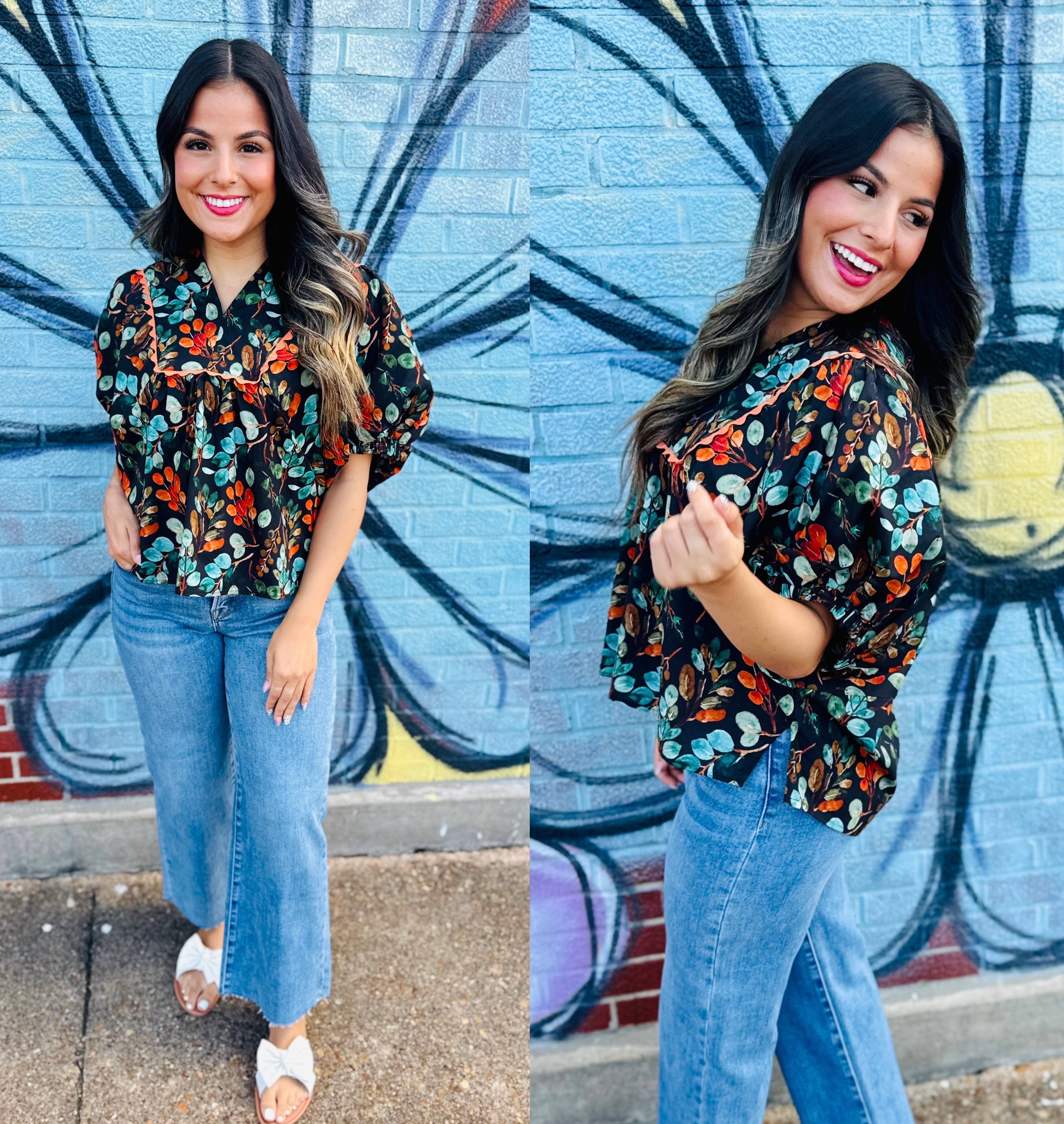 Botanical print V-neck band collar dolman sleeve top featuring contrast scallop trim inset accent. Unlined. Woven. Non-sheer. Lightweight. By Entro.