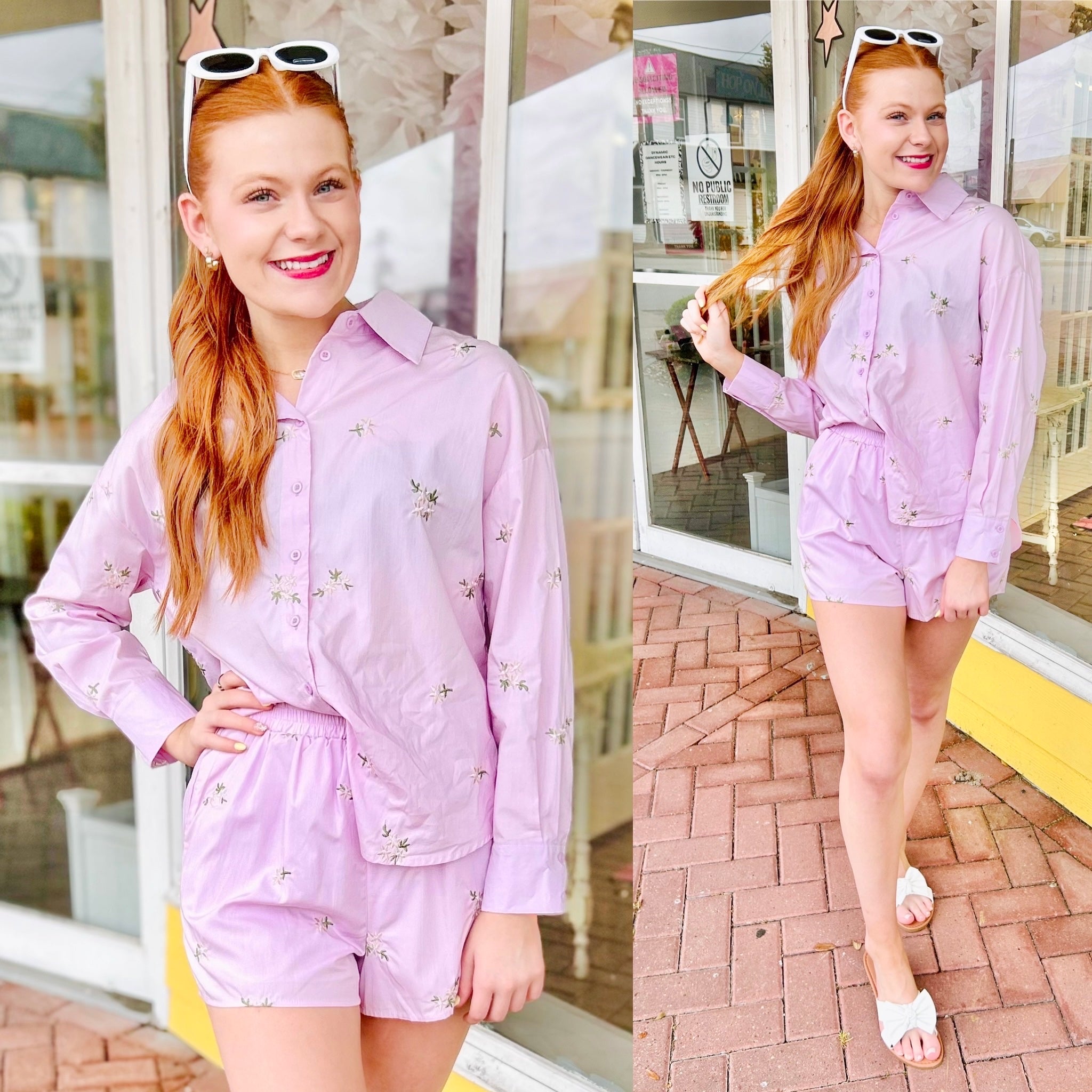 The cutest floral embroidery matching set with a button-down shirt and boxer style shorts.