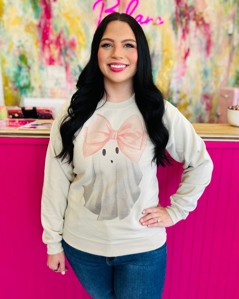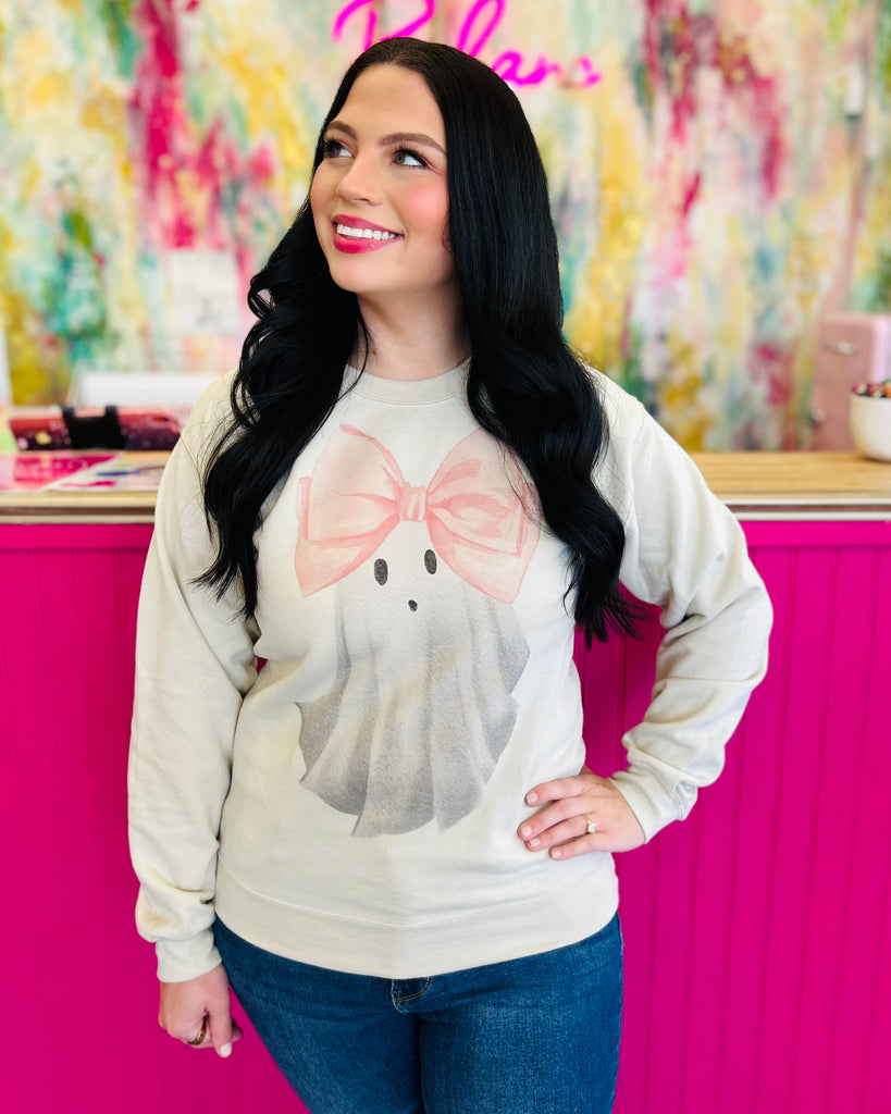 Natural unisex sweatshirt with an adorable ghost wearing a big pink bow