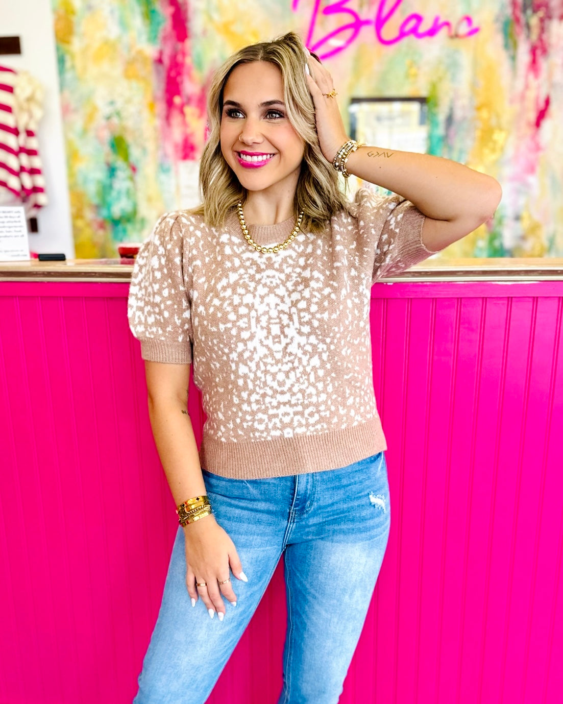 Animal pattern short puff sleeve sweater knit pullover top. Unlined. Knit. Non-sheer. Lightweight. By Entro!