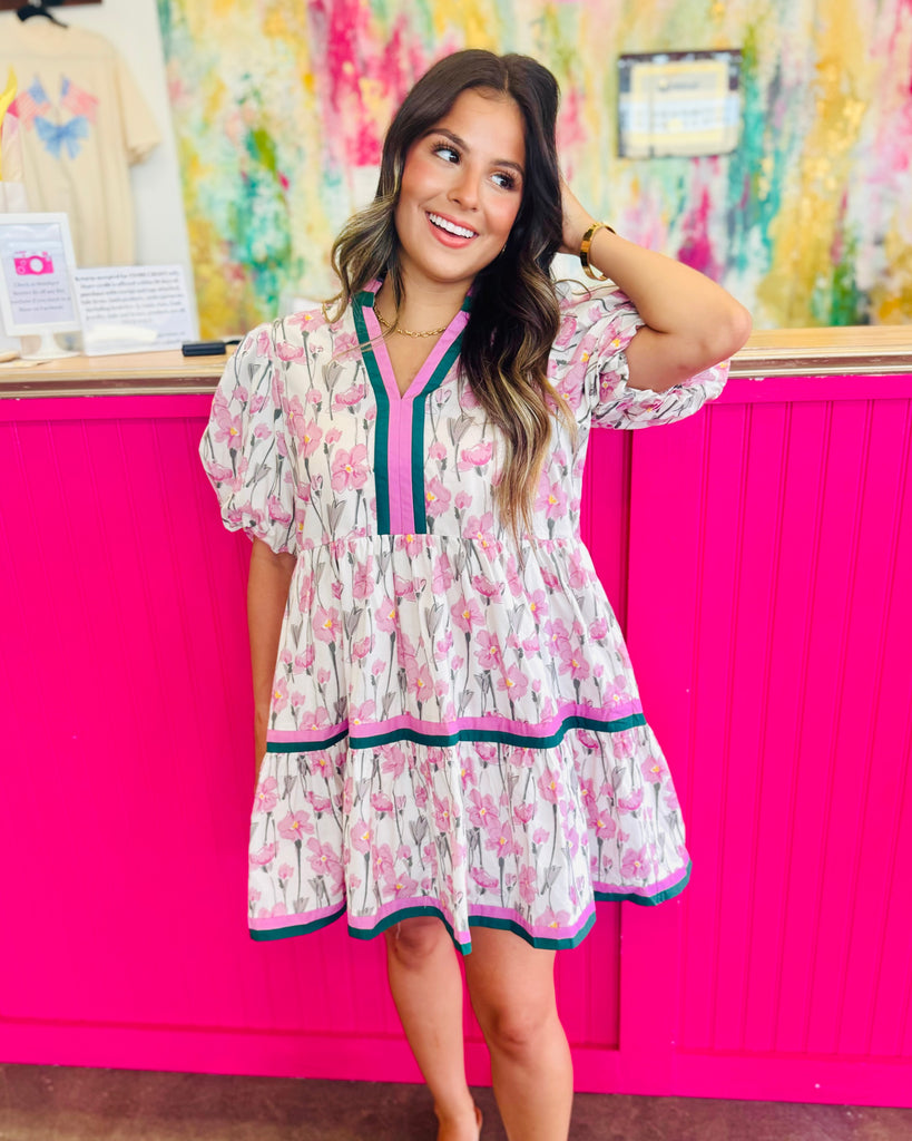 Floral print short bubble sleeve pullover tiered mini dress featuring accented multicolor band. Pockets at side. Lined. Woven. Non-sheer. Lightweight. By Entro!