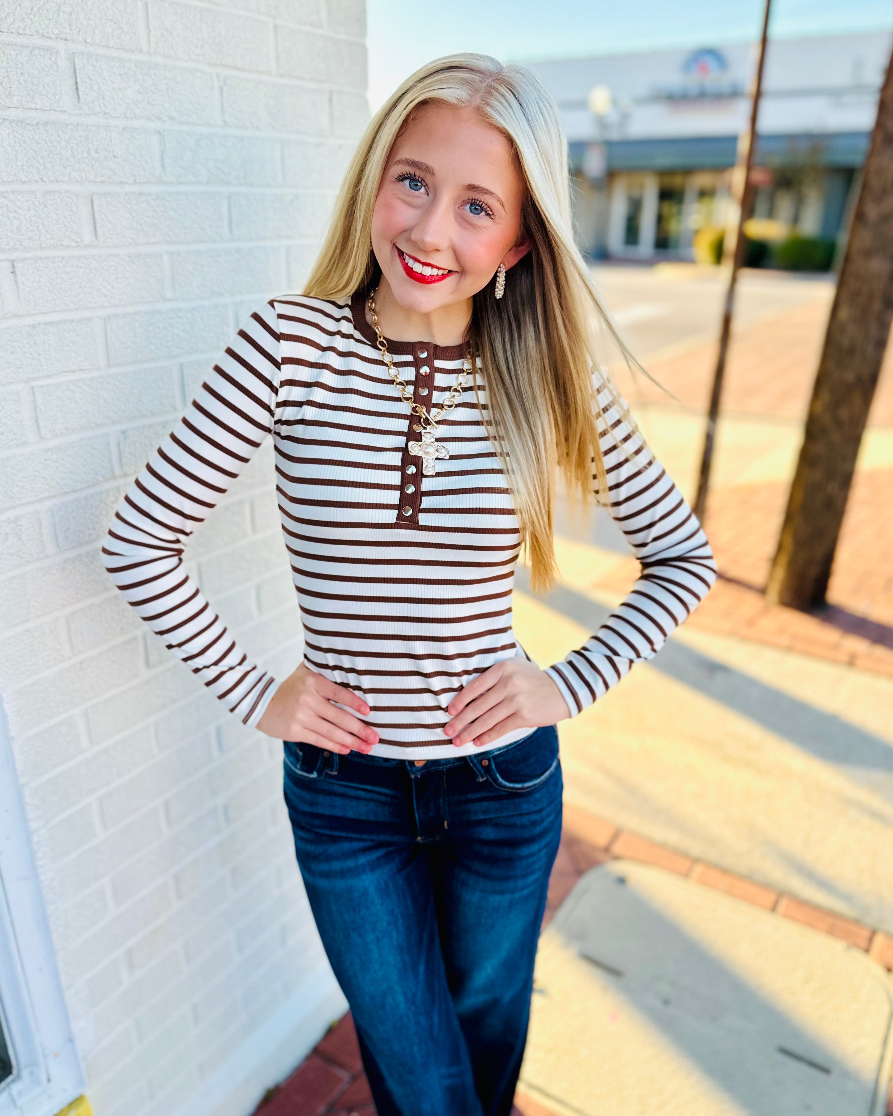 Elevate your everyday wardrobe with the Kaylee Stripe Henley Snap Button Rib Knit Top. This versatile piece combines classic henley styling with modern snap button detailing for effortless layering and styling flexibility. The soft rib knit fabric offers a comfortable, flattering fit that moves with you throughout your day. Subtle stripes add visual interest while maintaining a timeless appeal. Perfect for casual outings or dressed up with your favorite pieces, this top delivers both style and comfort in one essential piece.