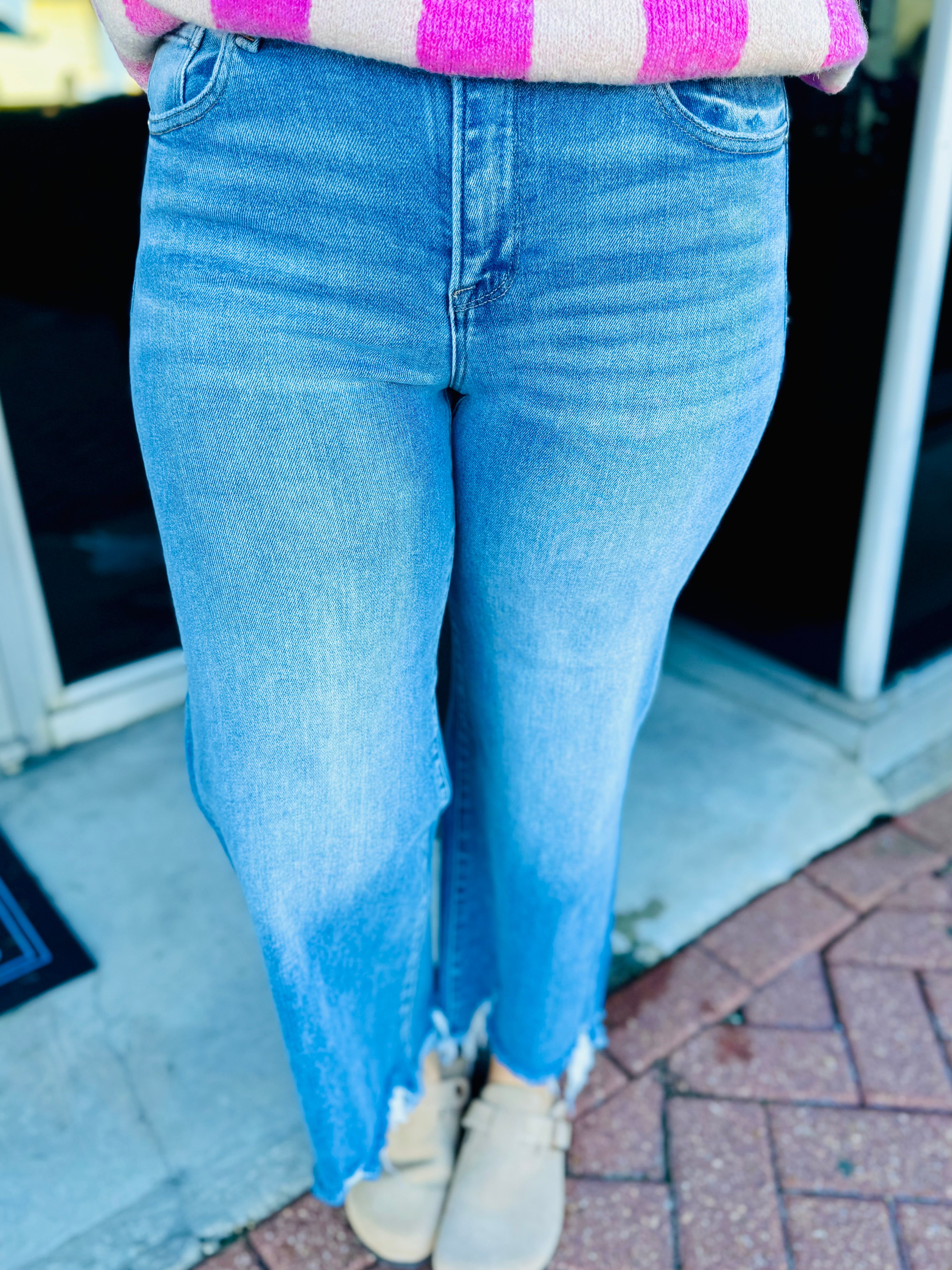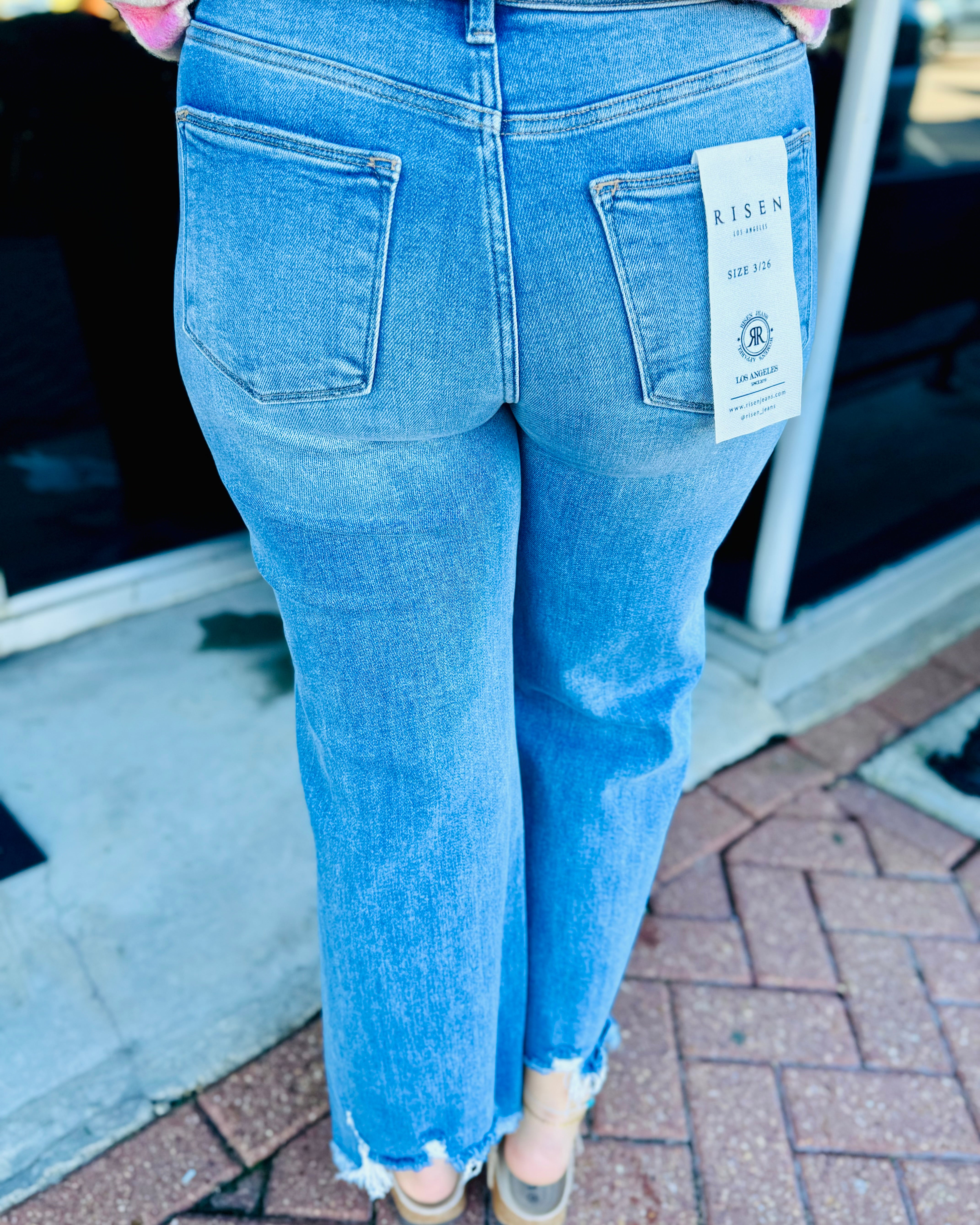 Elevate your denim game with these stunning high-rise crop jeans from RISEN JEANS. Featuring a flattering 10 1/2" rise and a chic wide step hem, they're designed to showcase your style with confidence. The perfect 27" inseam in size 3/26 creates an effortlessly polished look that transitions seamlessly from casual to dressed-up occasions. Experience the comfort and versatility that makes these Rachael jeans an essential addition to your wardrobe.
