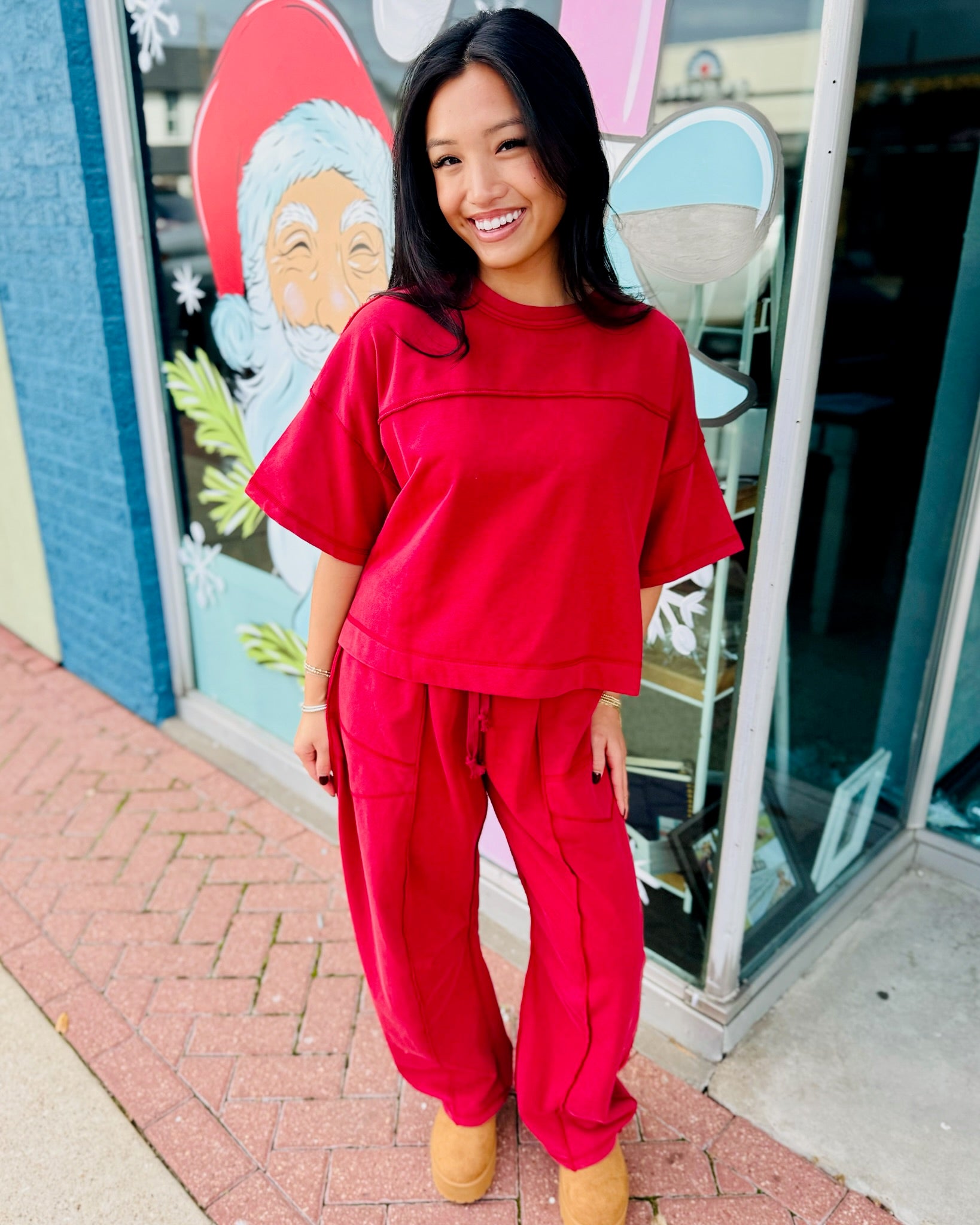 Discover effortless style with the Cherry Bomb Lounge Set—a mineral-washed two-piece that transitions seamlessly from relaxation to the streets. The boxy top pairs perfectly with barrel pants featuring distinctive exposed seams, while functional cargo pockets and an adjustable drawstring waist ensure all-day comfort. The softly washed finish delivers that coveted vintage aesthetic without sacrificing quality. Crafted from a breathable cotton-polyester blend (85% cotton, 15% polyester), this set is your go-to for layered looks or bold standalone styling that feels authentically curated.