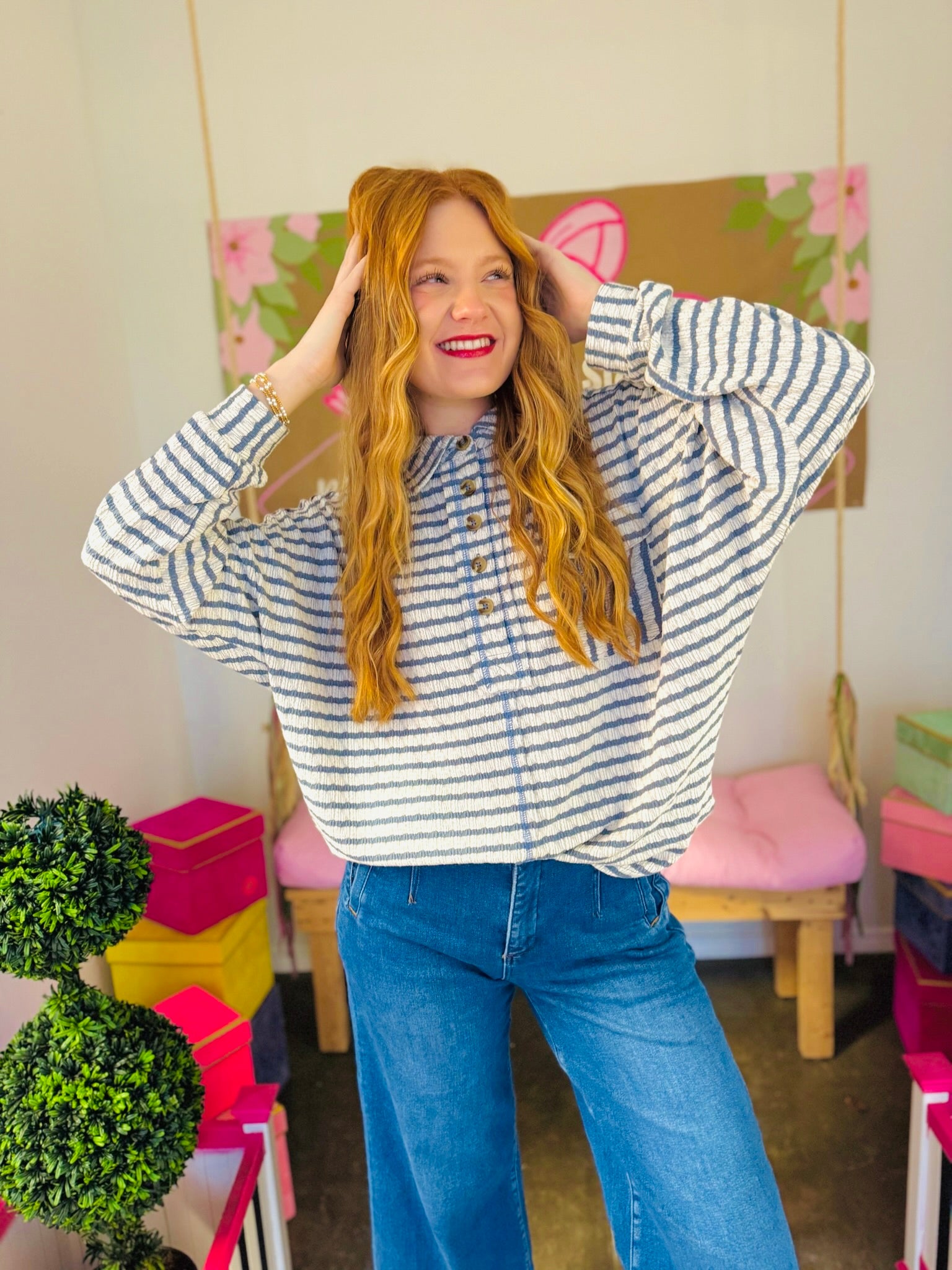 Cozy, stylish, and bound to turn heads. This oversized textured stripe knit features a batwing long sleeve, half button-down front, and collared design, blending casual comfort with effortless style.