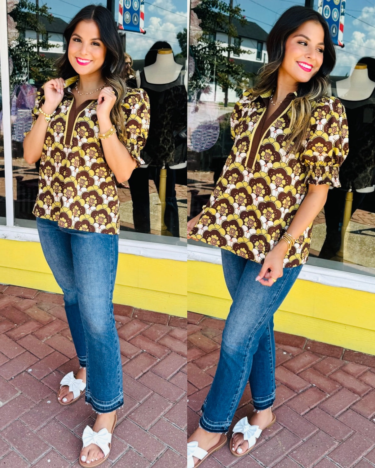 This lightweight woven top by Entro features a unique abstract floral pattern with short puff sleeves and smocked cuffs. It highlights a contrasting spread neck collar and is unlined and non-sheer, ensuring comfortable wear with style.