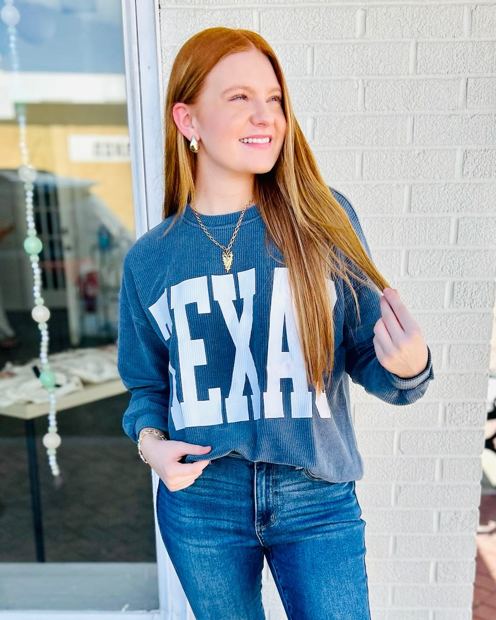 Celebrate your Texas spirit with this comfortable indigo pullover sweatshirt! Highlighted by striking “TEXAS” lettering on the front, this casual sweatshirt is ideal for sports events, running errands, or relaxing at home. Made from soft knit material and designed with a roomy fit, it offers all-day comfort throughout the seasons. Combine it with jeans, leggings, or your favorite sneakers to achieve a laid-back, stylish look effortlessly.