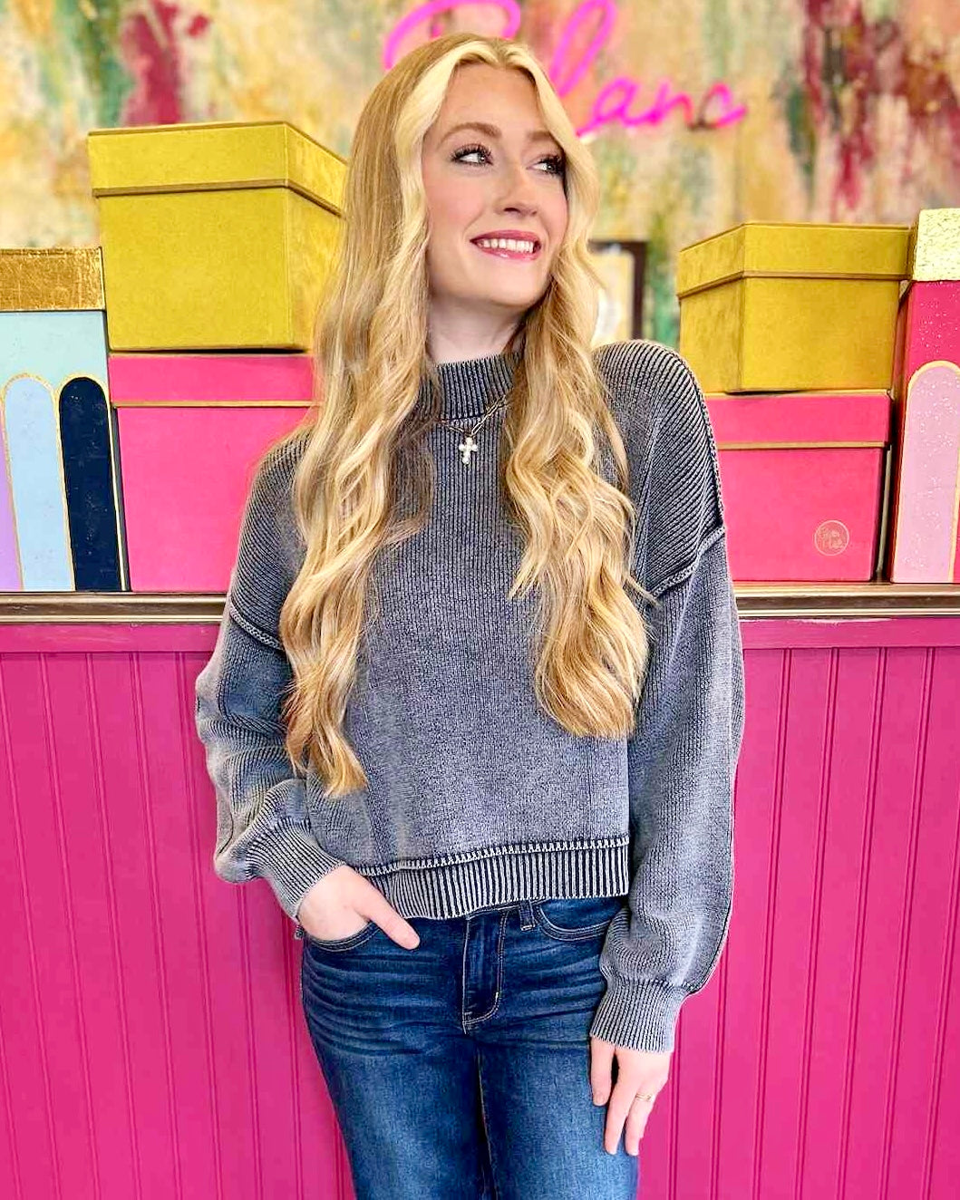 Effortlessly cool and ultra-cozy—this washed knit pullover is the sweater you’ll be living in all season long. The relaxed mock neck and soft washed finish give it that perfect “already broken-in” feel, while the slightly oversized fit makes it easy to style with jeans, leggings, or layered over a dress.