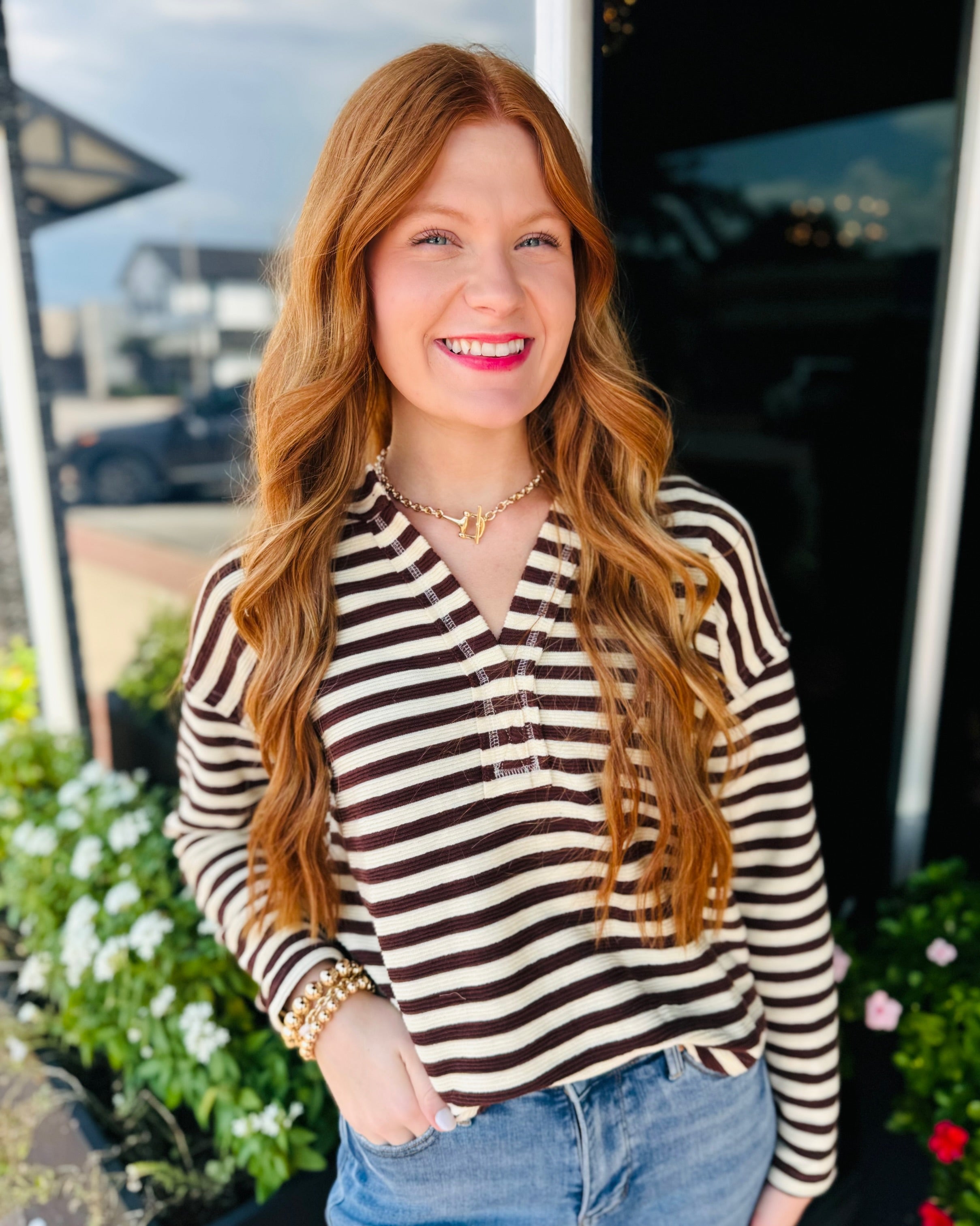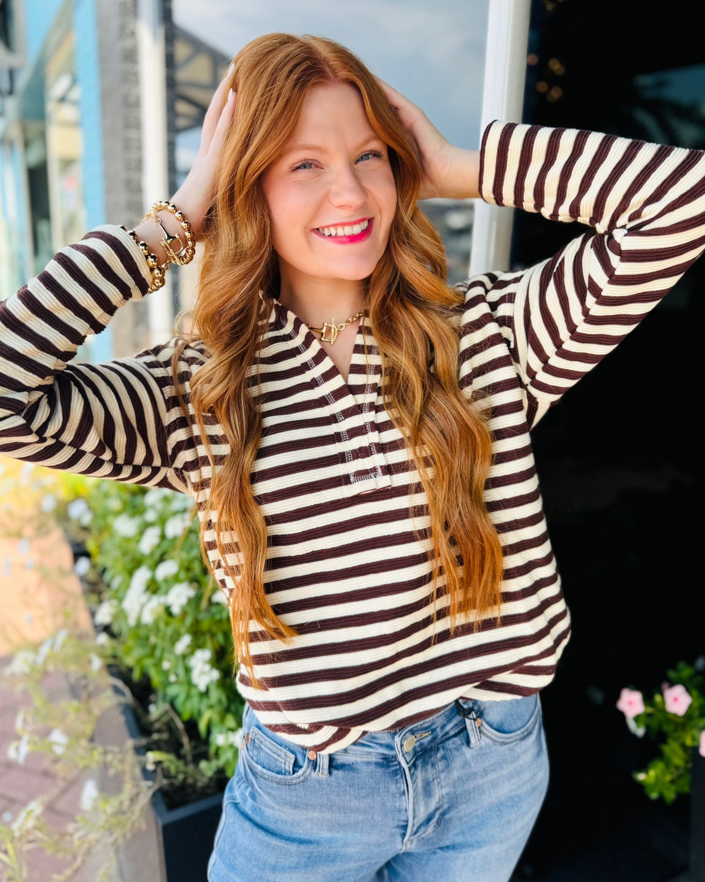 Chic, cozy, and effortlessly versatile—the Gisella knit top is your new go-to. With its textured striped design and flattering split neckline, it’s the perfect blend of casual comfort and boutique style. The lightweight knit makes it great for layering or wearing solo, keeping your look polished no matter the season.