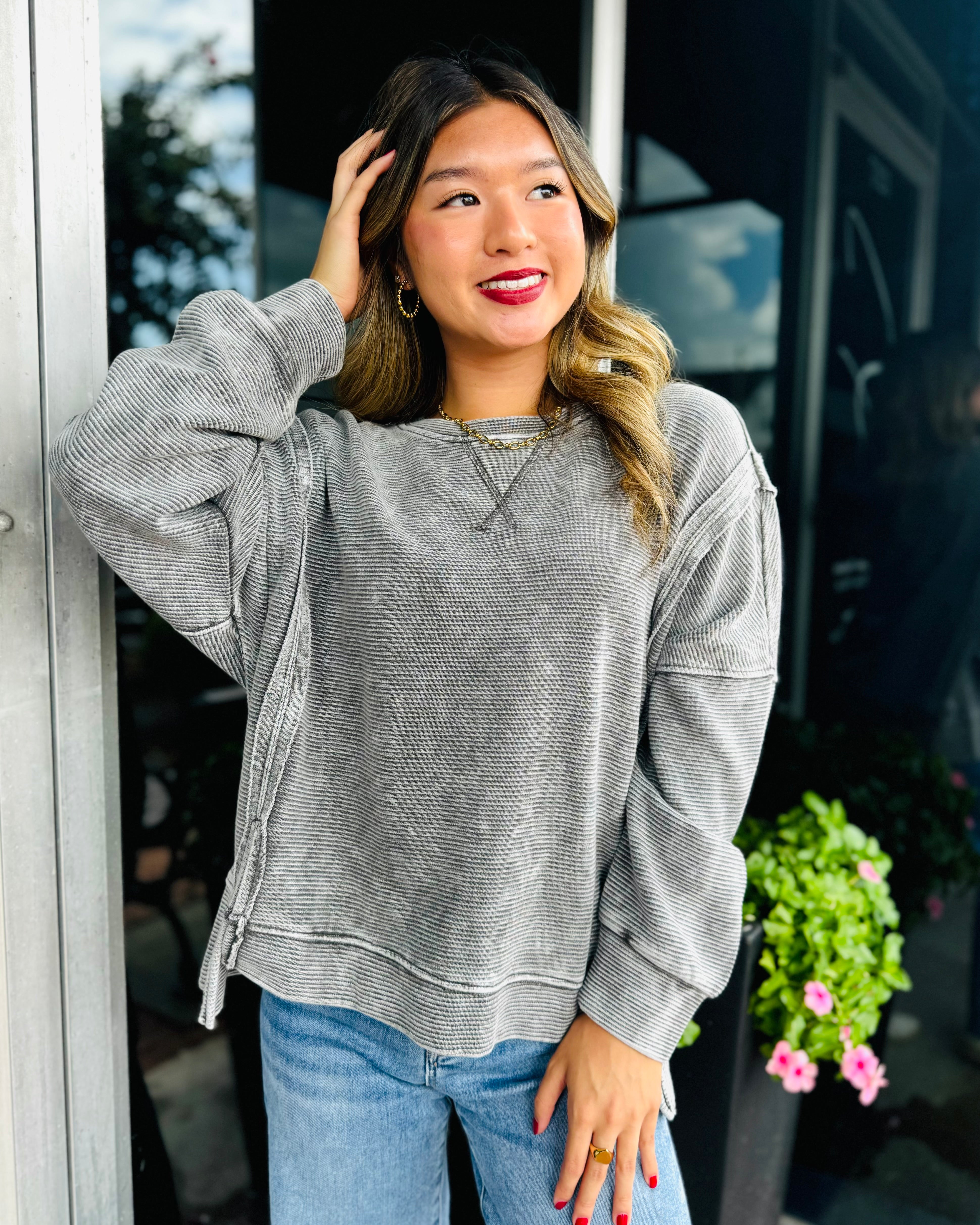 Effortless and edgy, this washed knit top is the perfect mix of comfort and modern style. Designed with exposed seam detailing and side slits, it adds texture and movement while keeping a laid-back vibe. The washed finish gives it a soft, lived-in look that pairs perfectly with denim, leggings, or layered under jackets.