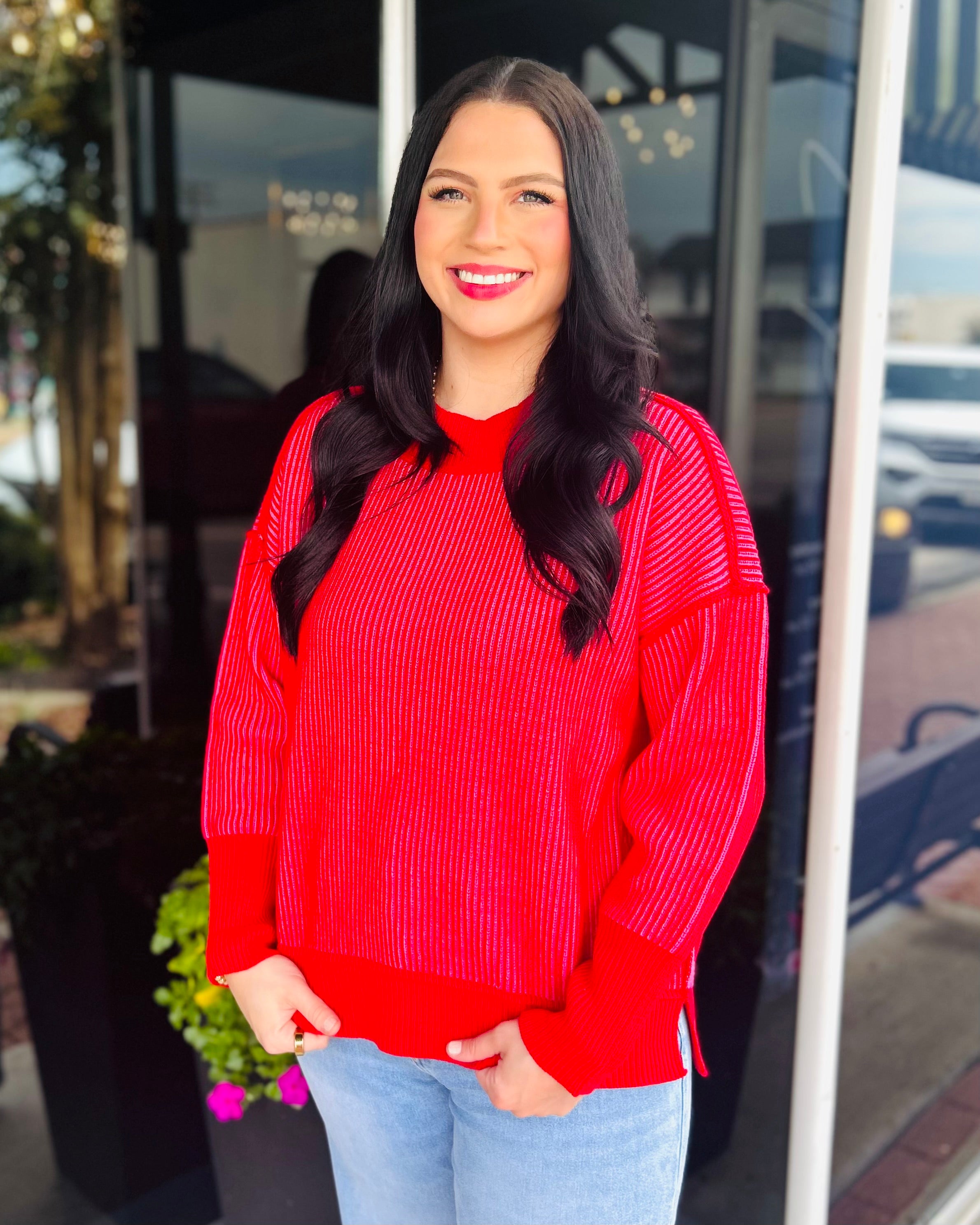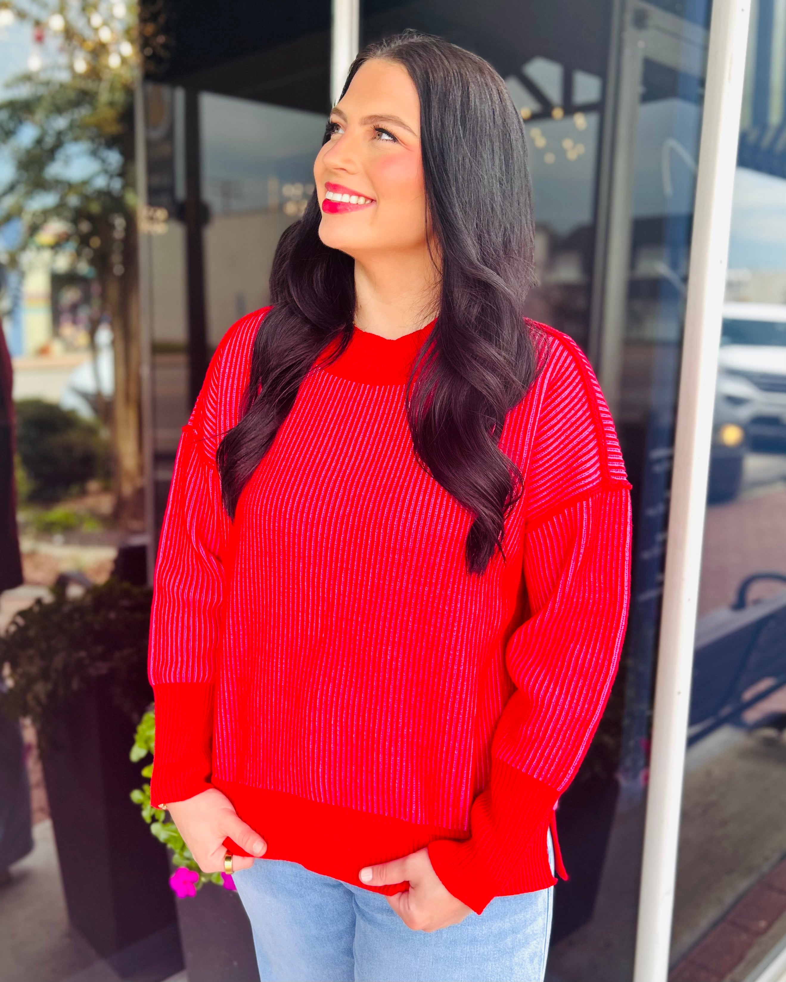 Experience style and comfort with the Exposed Seam Two-Tone Sweater, featuring a hi-low hem and side slits for a modern silhouette. Designed with a relaxed fit, it measures approximately 24" in the front and 25" in the back, with a 52" chest width (from S/M). Crafted from a cozy blend of 45% cotton, 30% acrylic, 13% viscose, 7% polyester, and 5% nylon, this sweater offers both softness and durability for everyday wear.