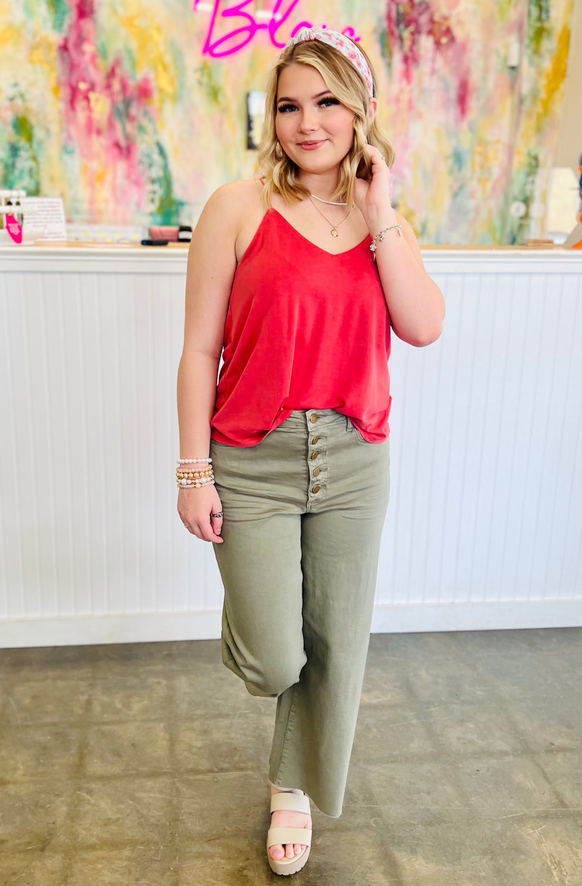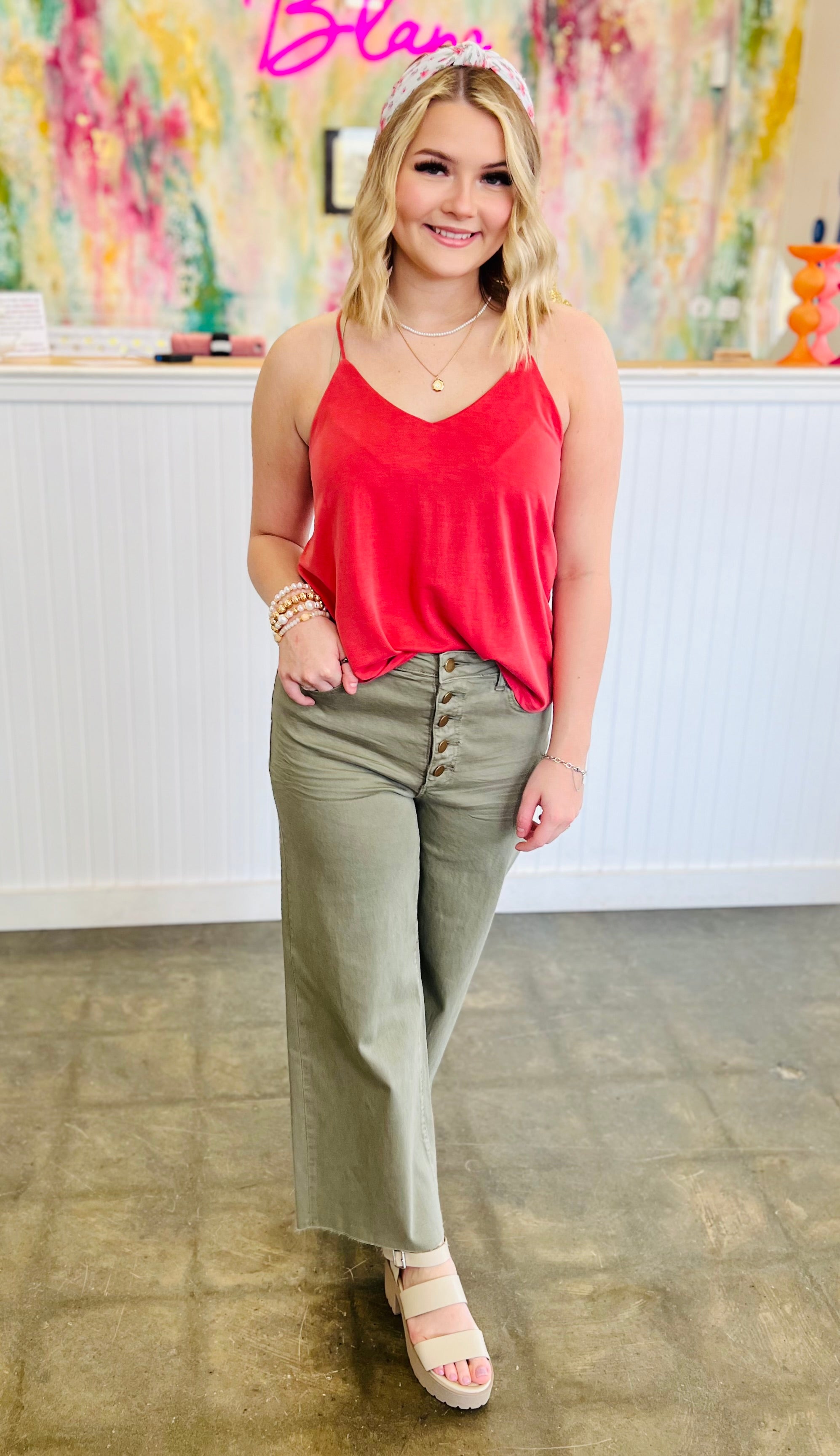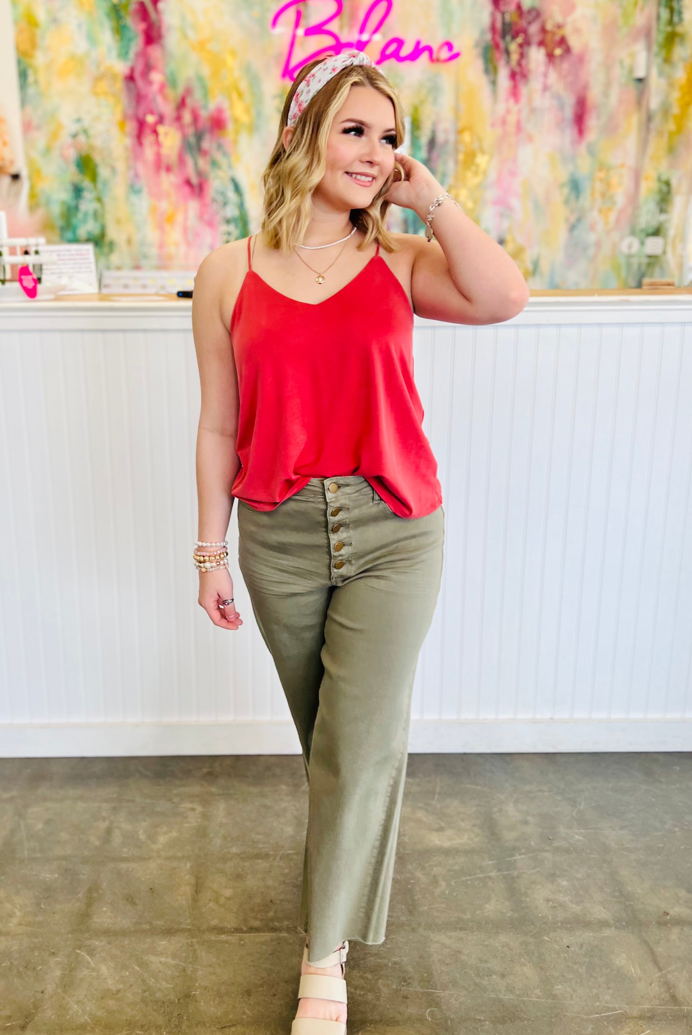 This cami top is the perfect piece you've been looking for. This gorgeous top displays a V-neckline, spaghetti shoulder straps and a swingy relaxed fit bodice. Pair it with your favorite denim jeans to complete the look.