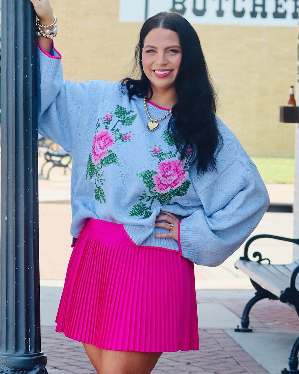 This "Something Blue" sweater from Fantastic Fawn features delicate rose cross-stitch embroidery and a jacquard knit design, crafted entirely from soft, durable 100% acrylic for comfort and style.