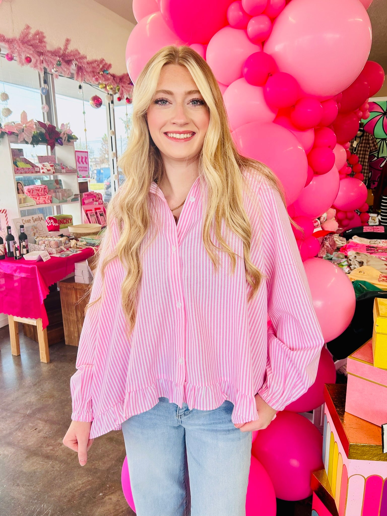 Elevate your everyday wardrobe with this striking pin-striped oversized shirt from Fantastic Fawn. Featuring a classic collared neckline, voluminous puff sleeves, and a charming ruffle hem, this piece effortlessly blends sophistication with modern style. Crafted from a comfortable 65% polyester and 35% cotton blend, it's designed to move with you while maintaining its shape. Perfect for layering or wearing solo, this long-sleeved top delivers versatile elegance for any occasion. By Fantastic Fawn!