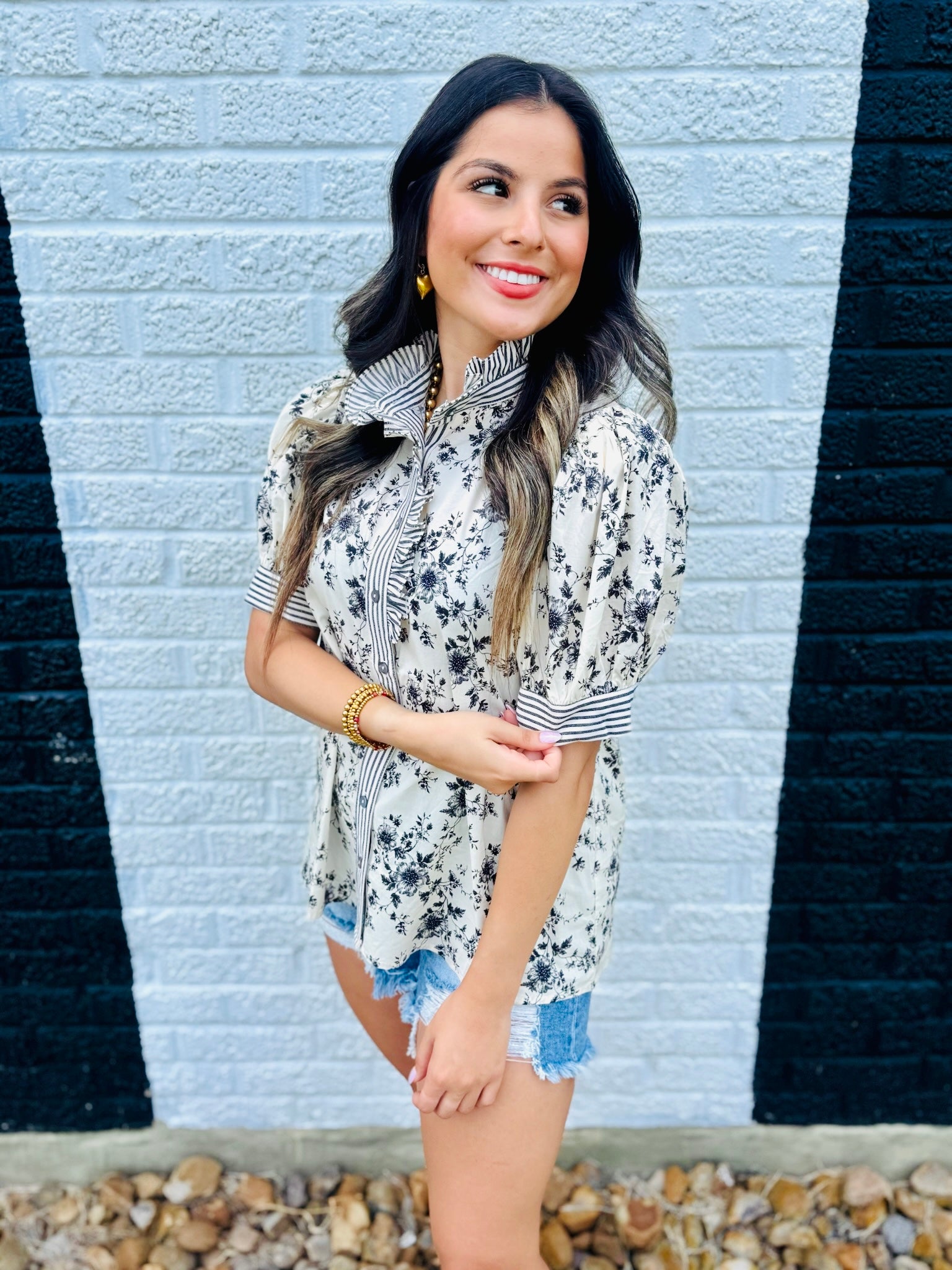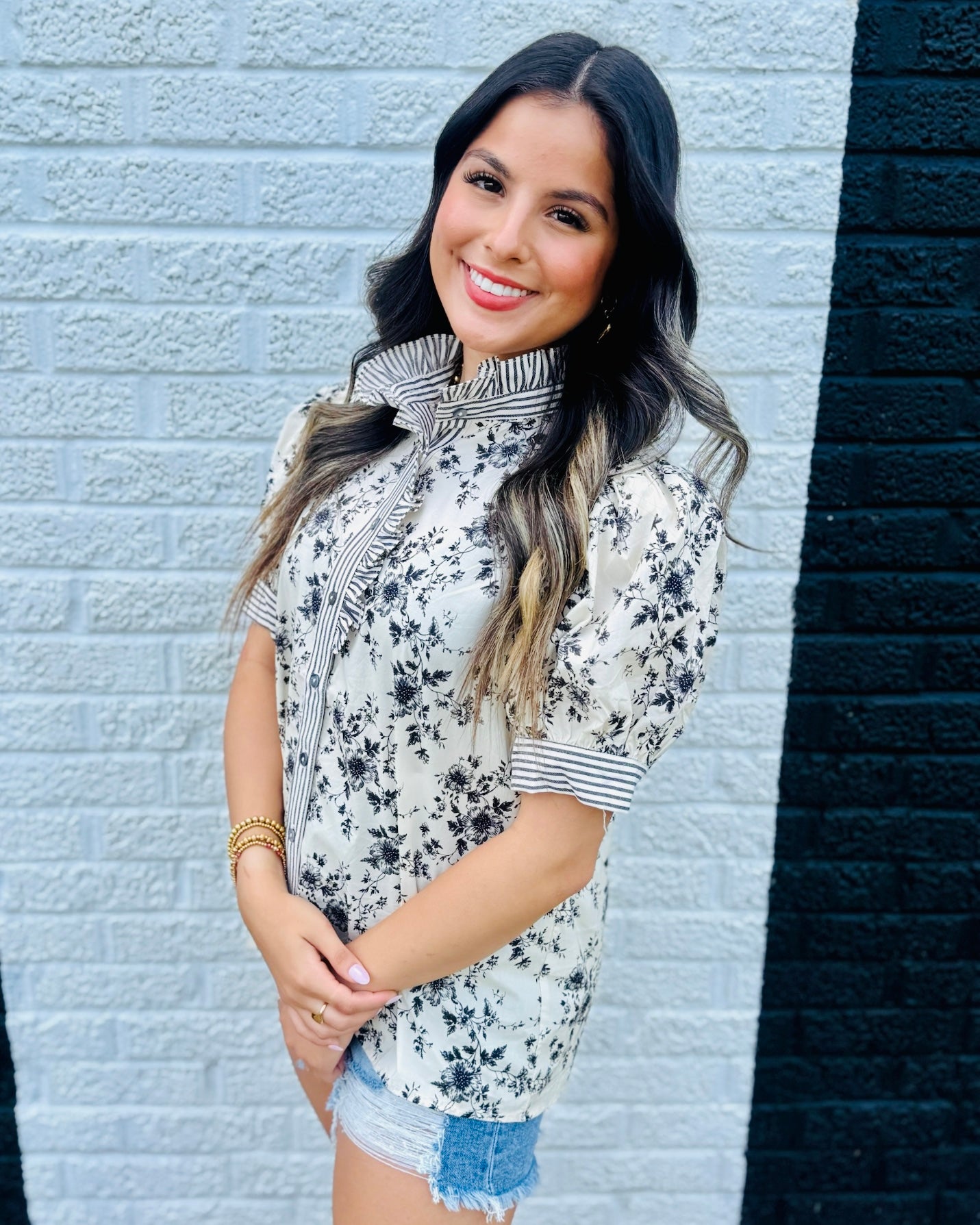 This short sleeve top showcases a floral print with puffed shoulders and a striped ruffle neck band for a striking contrast. It features a button-front closure and is crafted from lightweight, woven 100% cotton fabric. Unlined and non-sheer, this top offers both comfort and style. Designed by Entro, it’s perfect for a fresh, refined look. Also available in plus sizes!