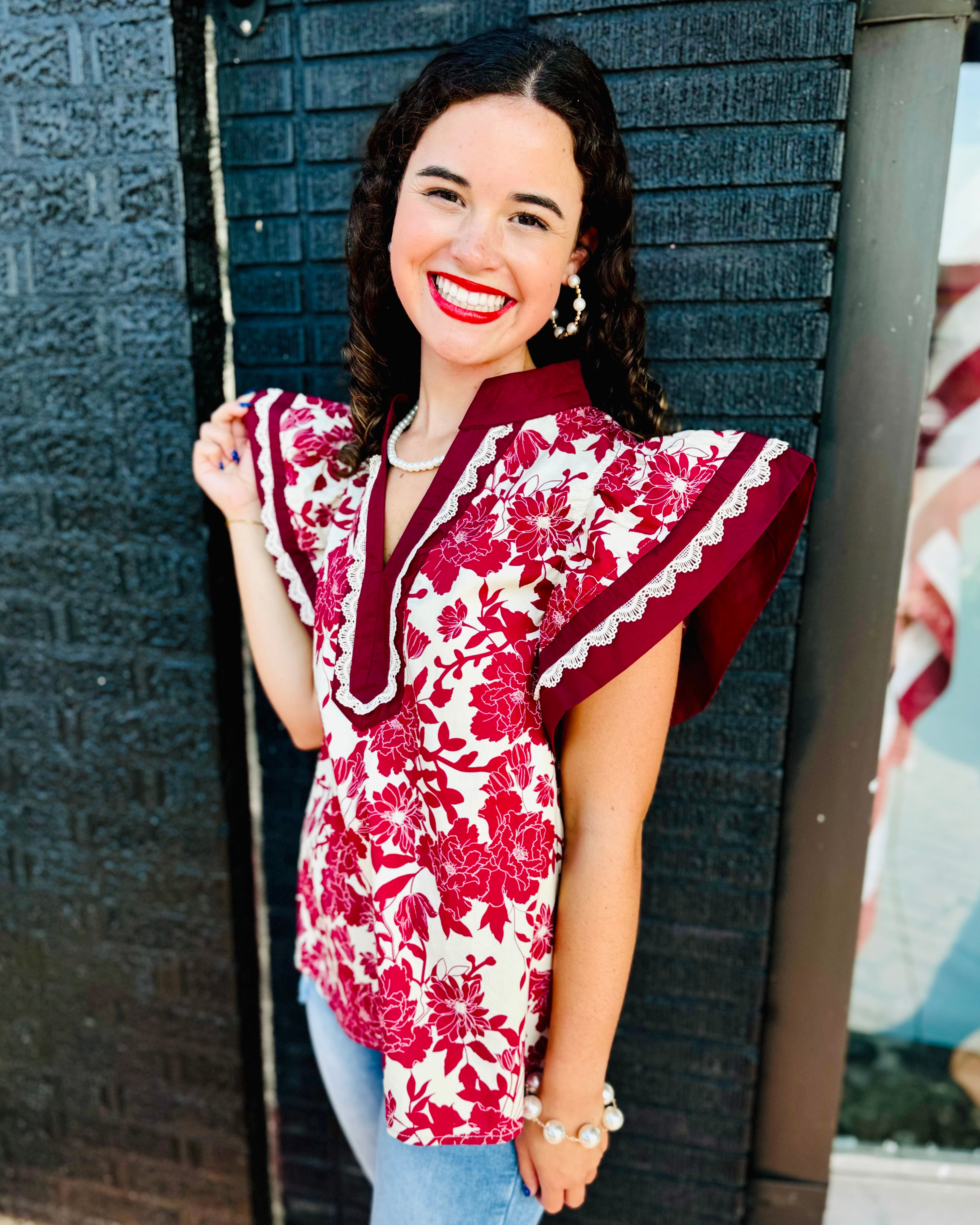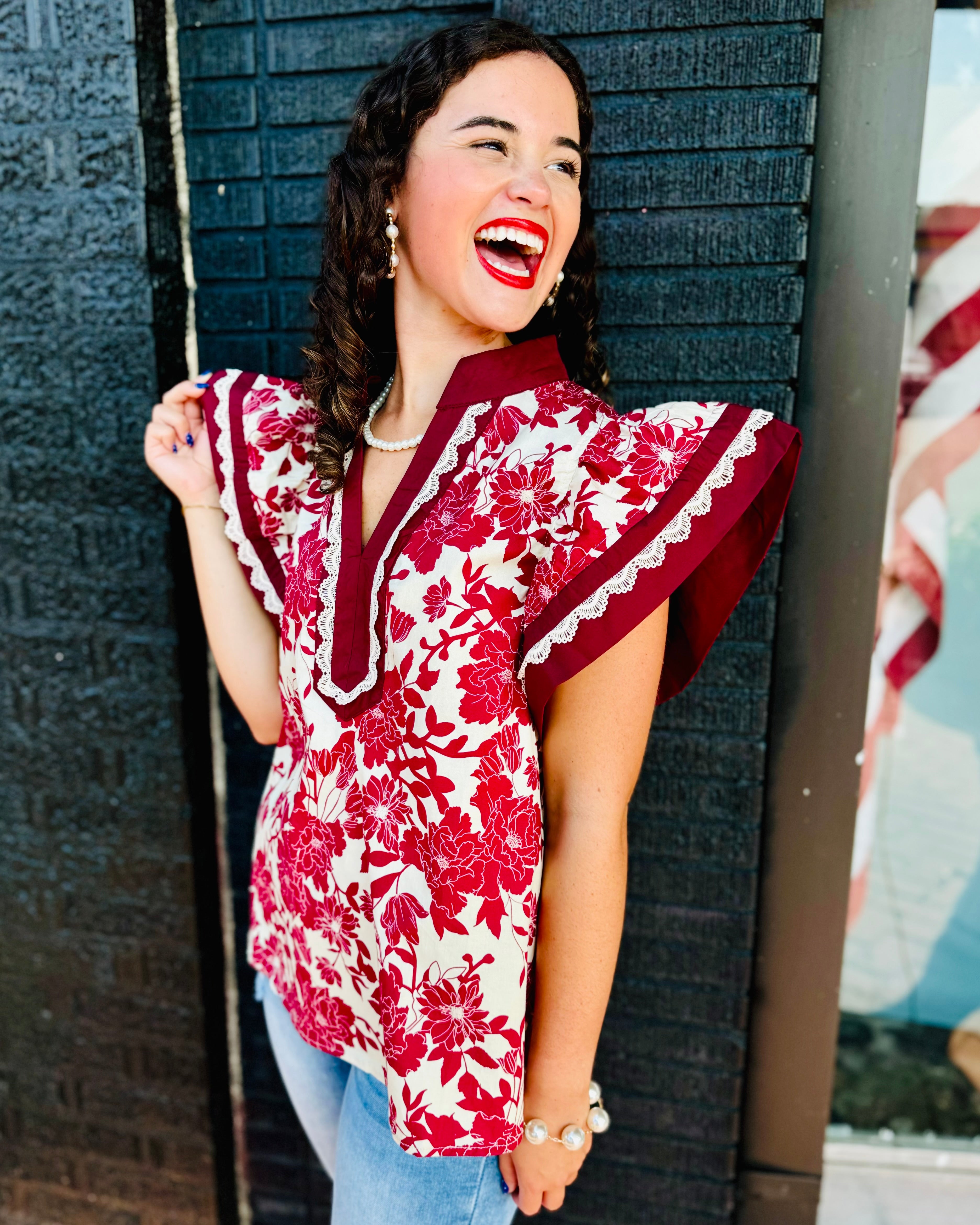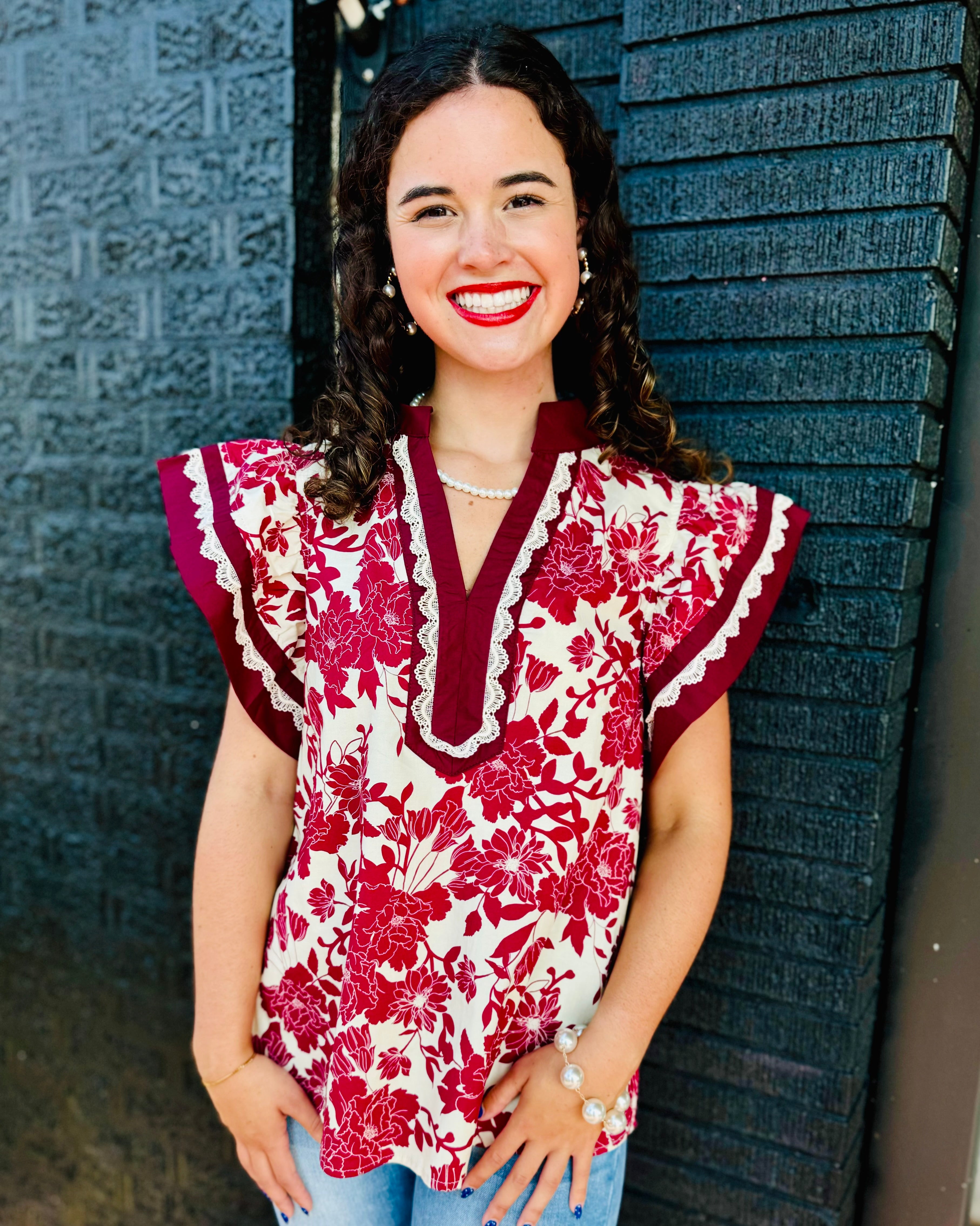 Fresh, feminine, and oh-so-flattering—this Entro floral print top is a must-have for effortless everyday elegance. The bold red floral pattern pops against the neutral background, while flutter sleeves and scallop lace trim add a sweet, boutique touch. Perfect for pairing with denim for a casual day out or dressing up with tailored pants for brunch, this piece will quickly become a closet favorite. Available in plus size.