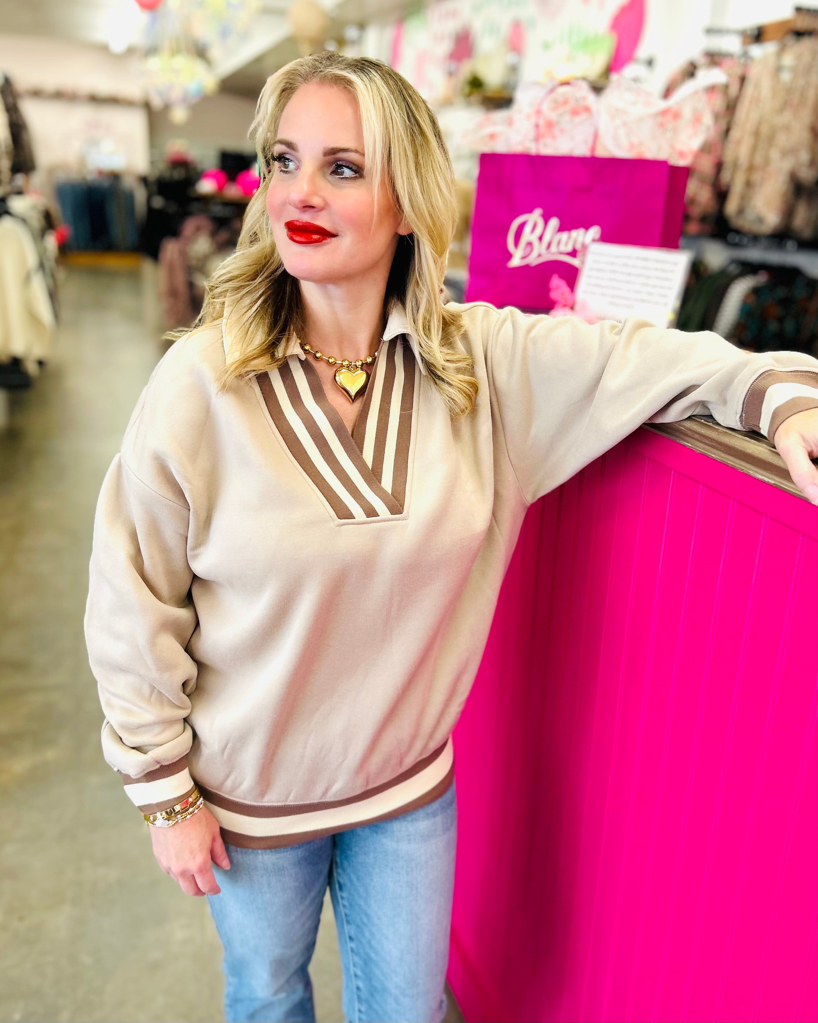 This V-neck long sleeve knit pullover features a standout contrast ribbed trim, designed by She + Sky.