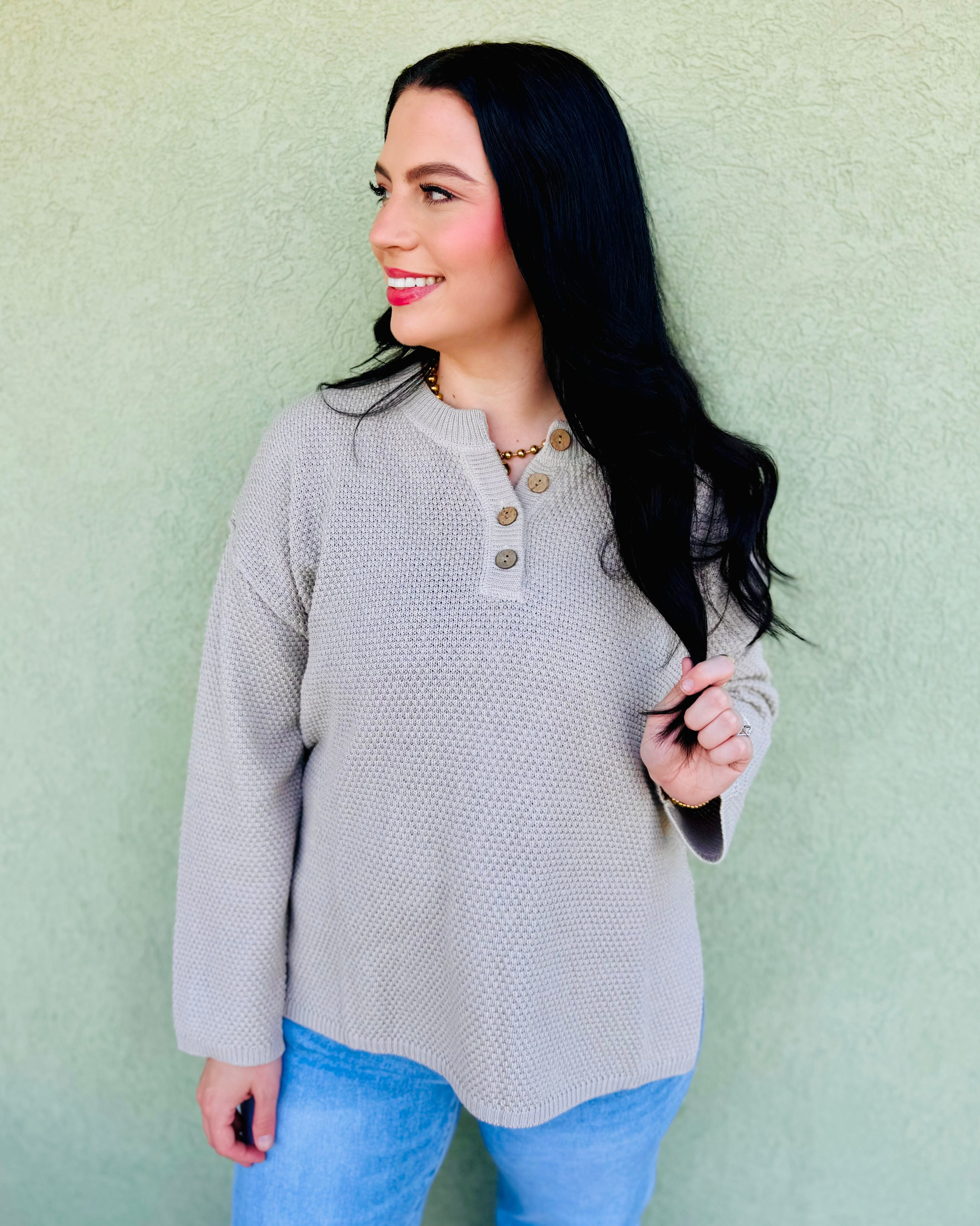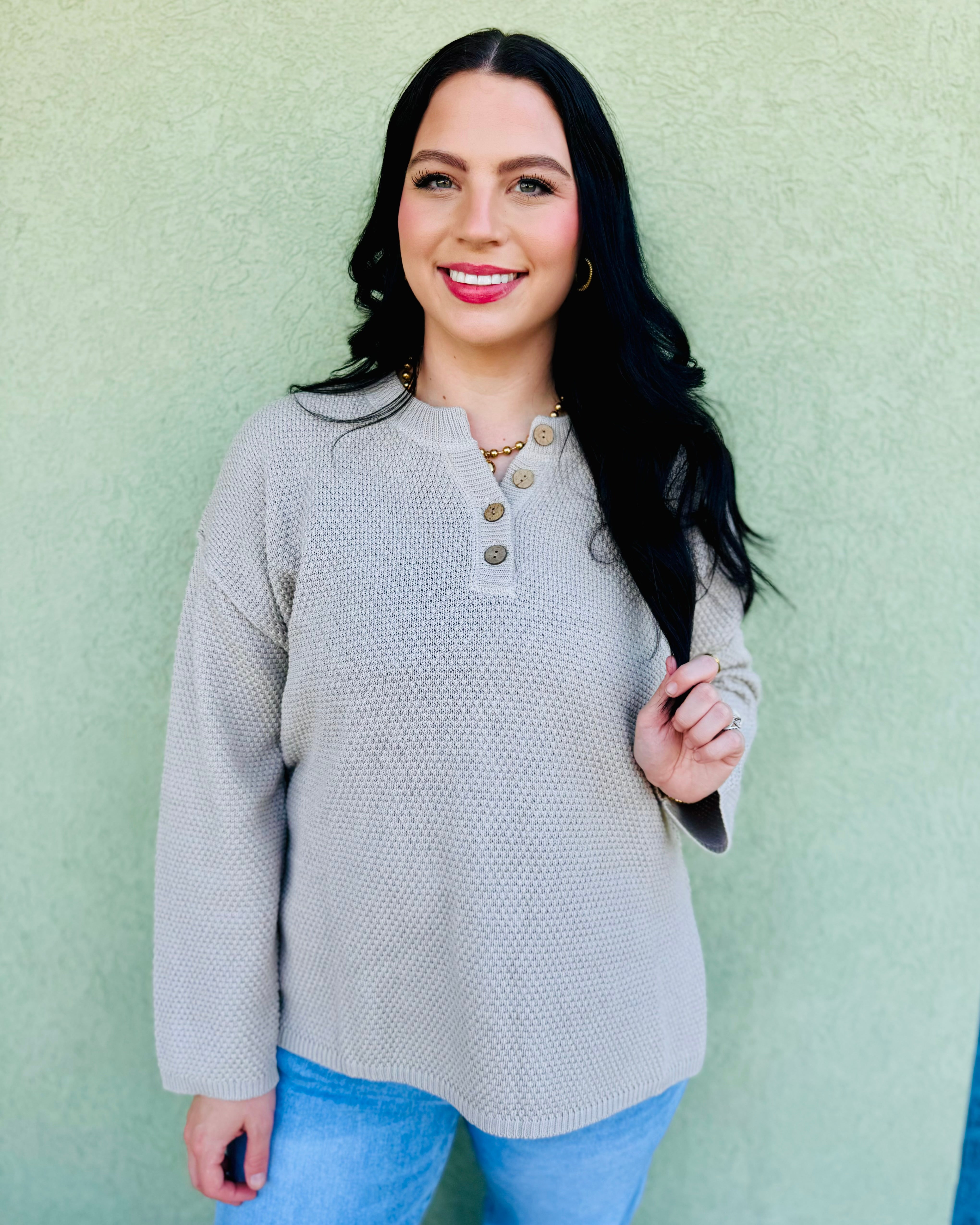 Experience the comfort and style of the Meadow, a knit sweater featuring a textured design and a classic Henley button detail.