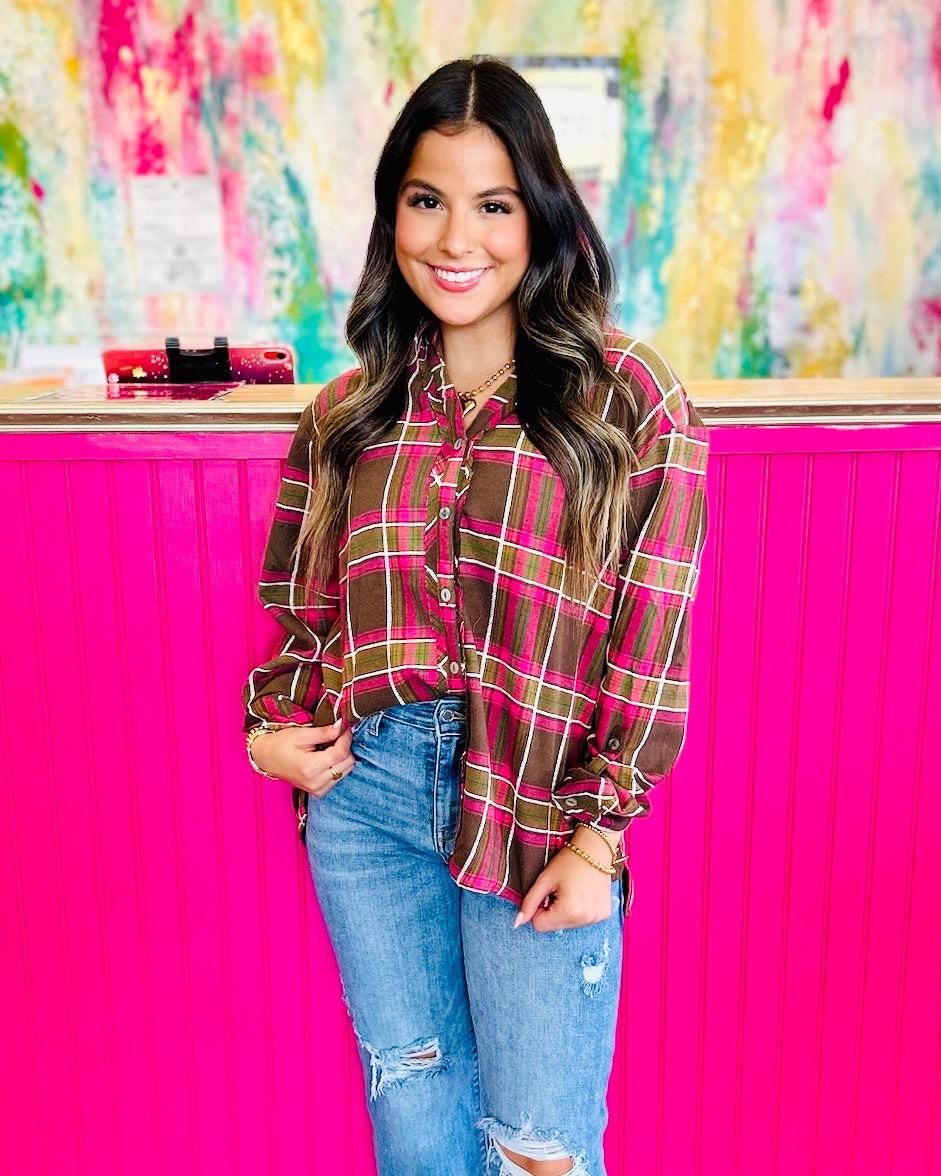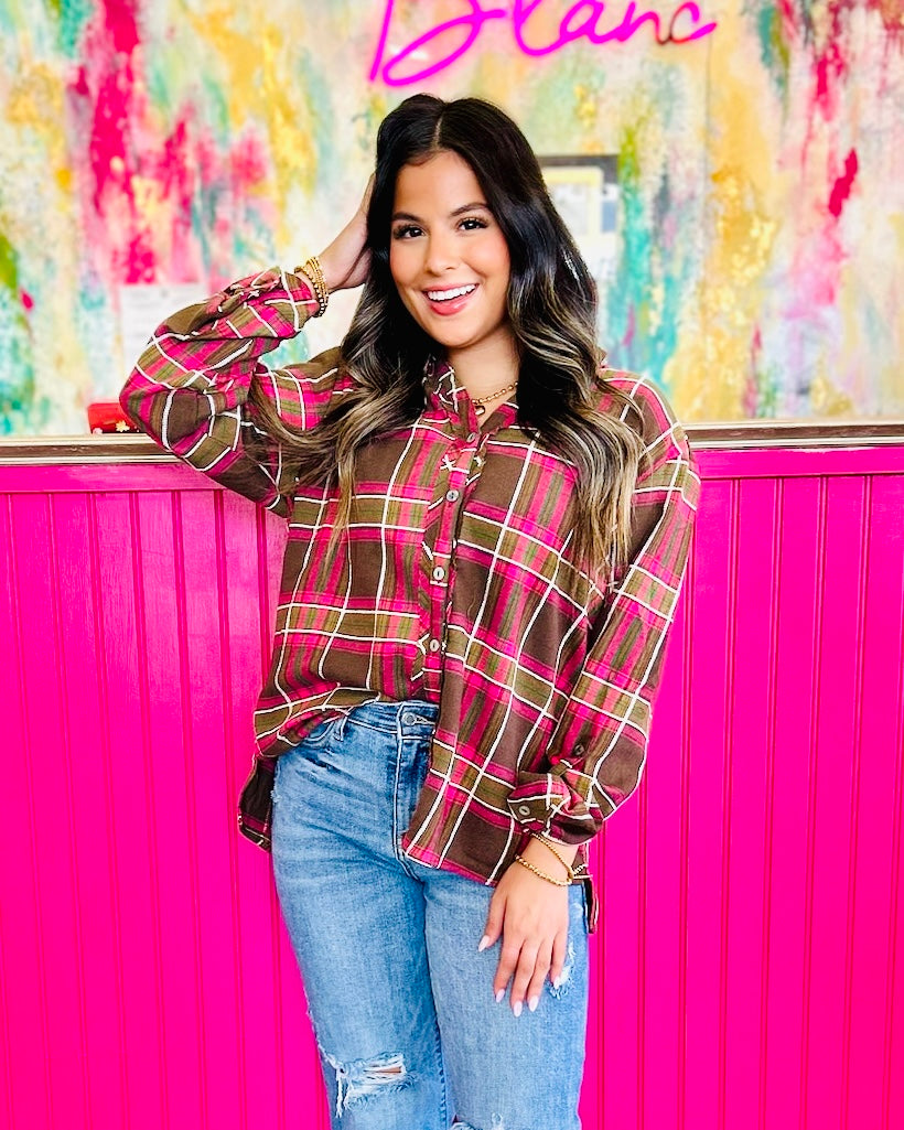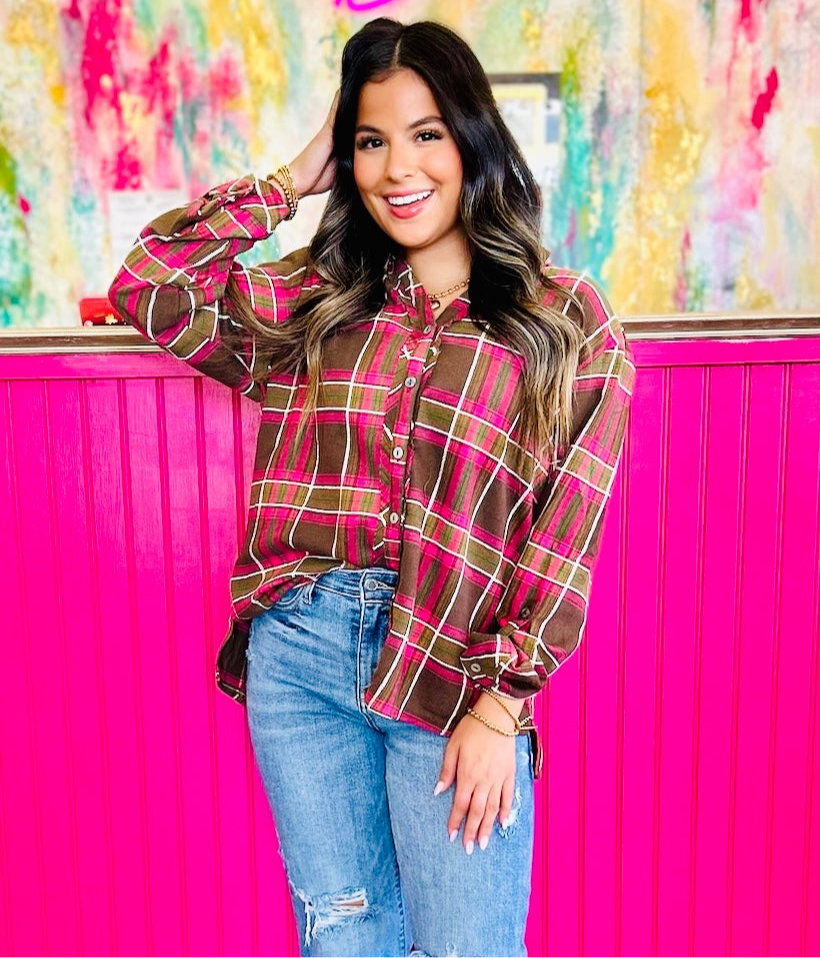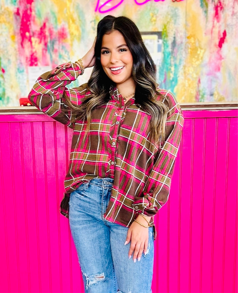 A timeless favorite with a playful twist—this Umgee checkered button down top is made for easy layering and everyday wear. Featuring raw cut edges, adjustable sleeves, and a relaxed fit, it’s a versatile piece that works tucked, tied, or worn open over a tee. The mix of earthy tones with pops of pink gives it that boutique-worthy charm you’ll love styling again and again.