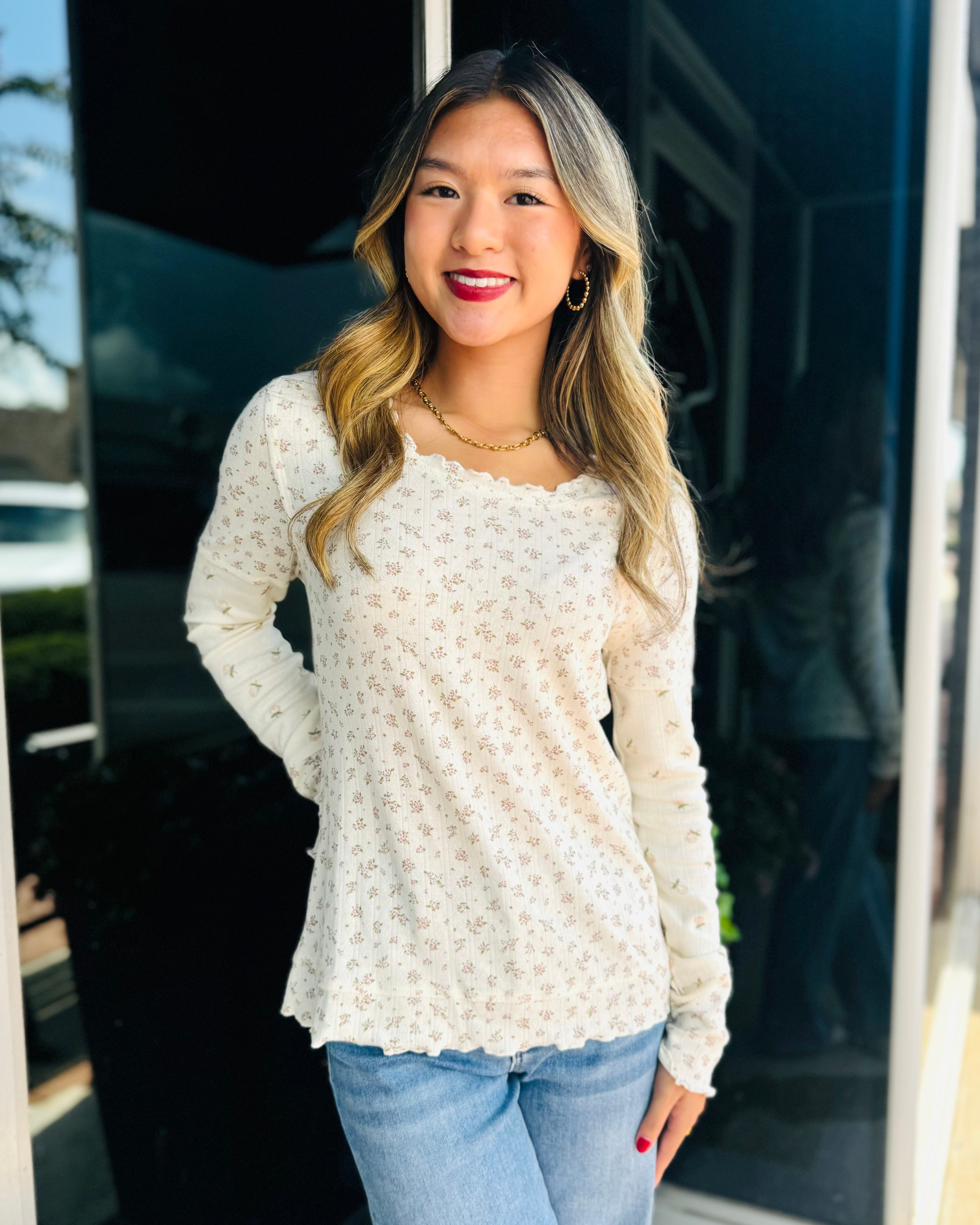 Floral print fitted knit top with a delicate lettuce hem, featuring a round neckline and long sleeves for an elegant, flattering look.