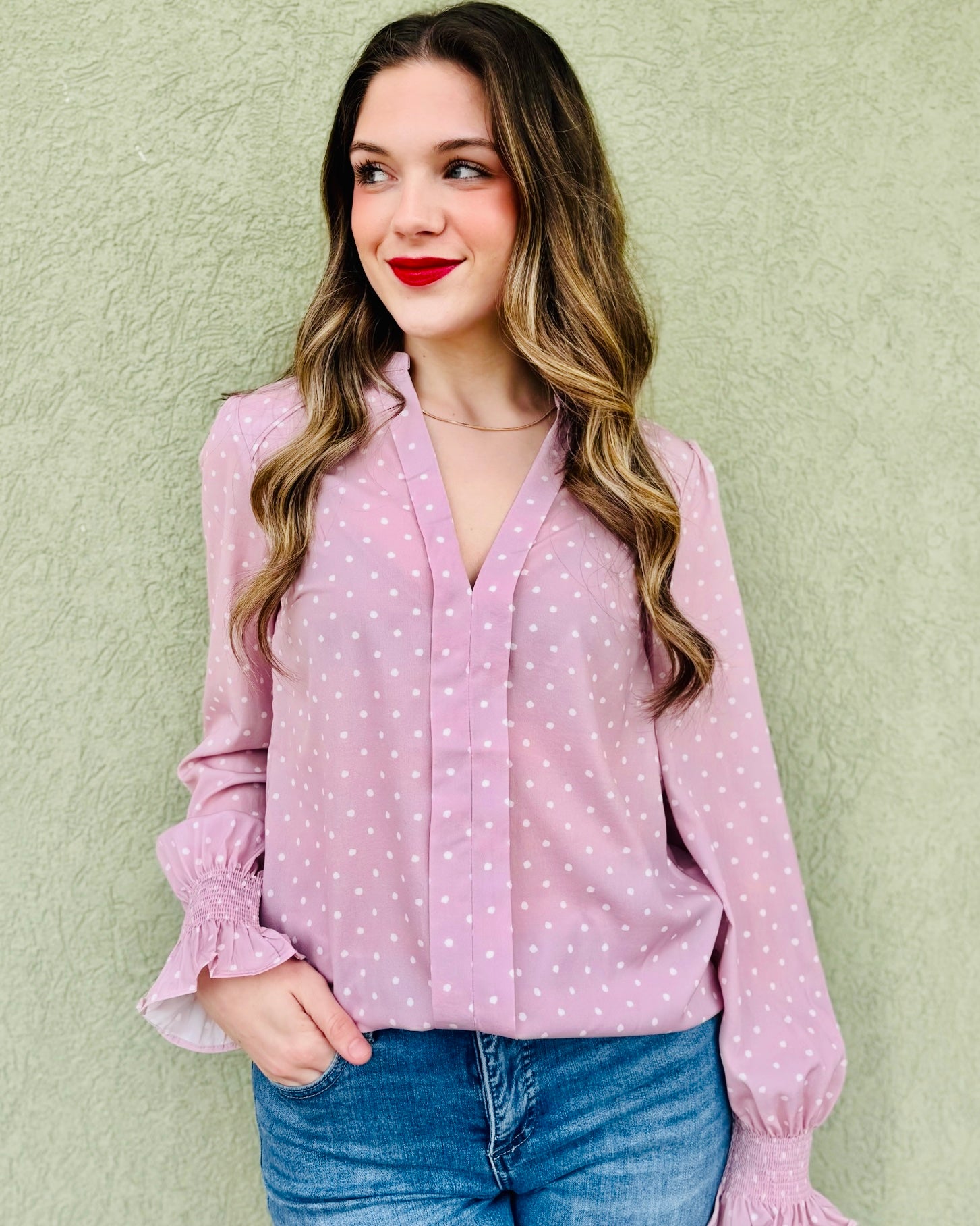 Looking for a top that’s playful yet effortlessly chic? The Cora Woven Top features soft woven fabric with a delicate dot print, smocked long sleeves, and a subtle neck band with placket detail, creating a polished and feminine silhouette perfect for everyday wear.