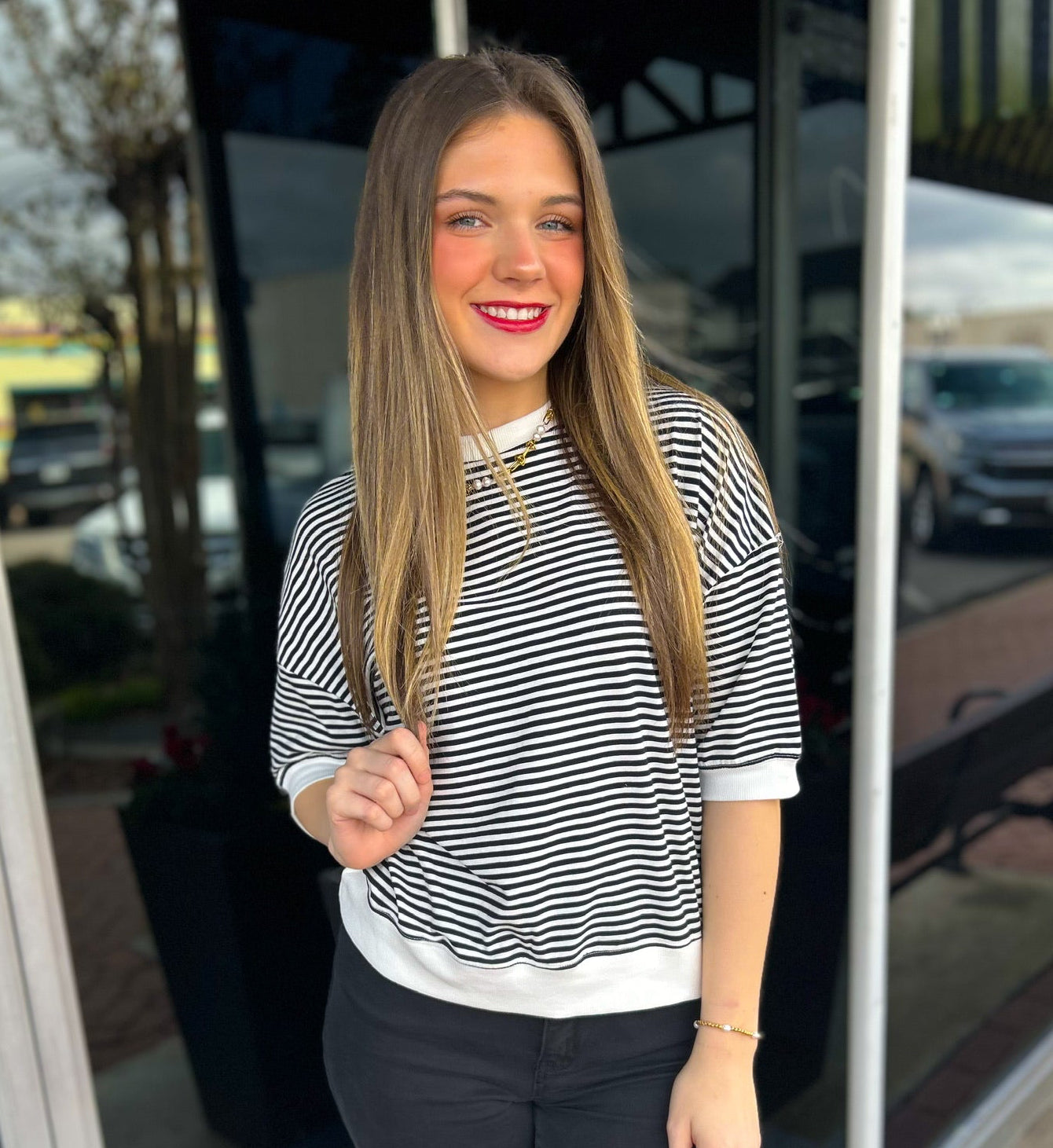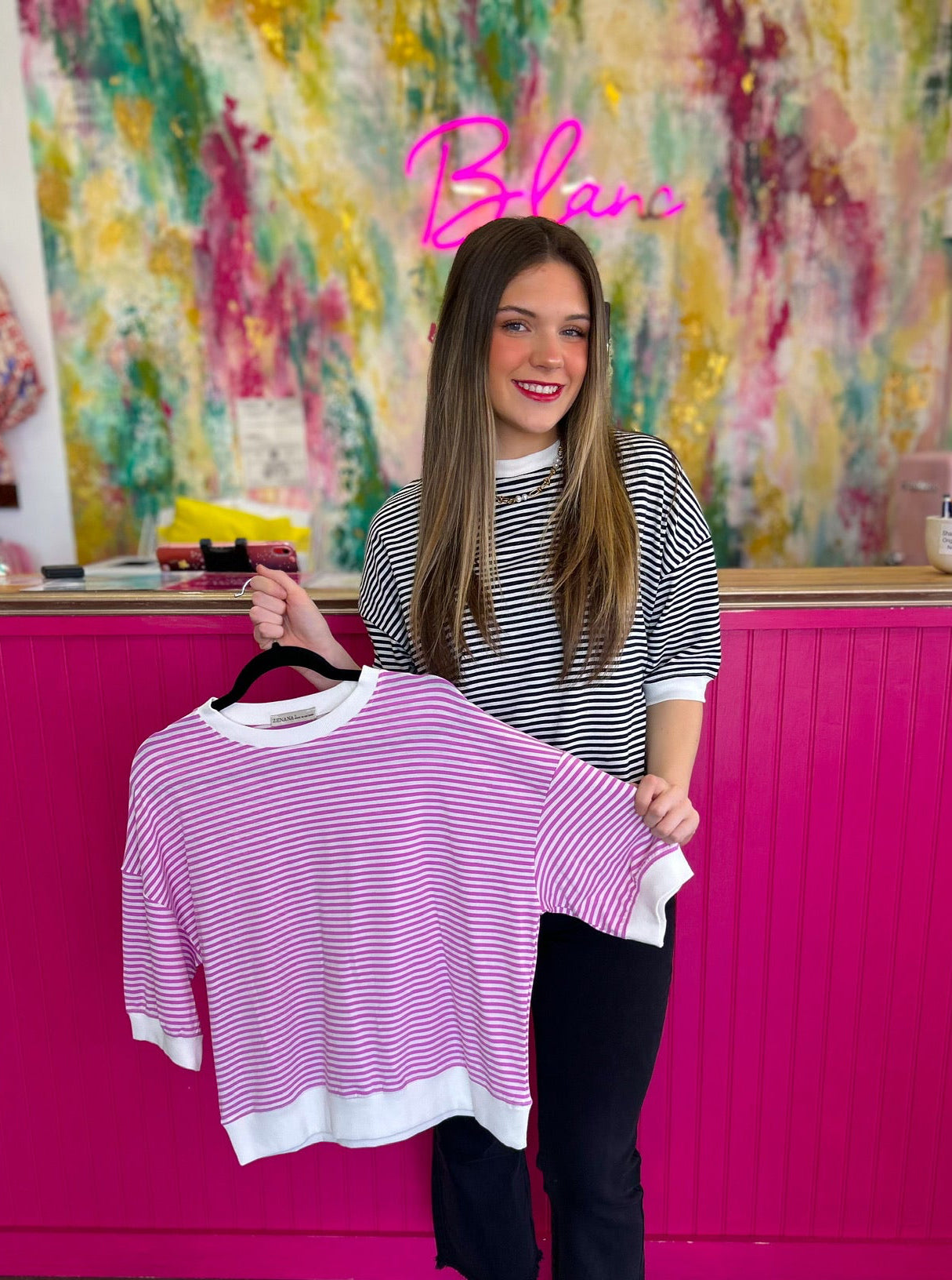 Your wardrobe just found its new staple. The Lyla Striped Top features bold stripes, contrast trim, and a banded bottom for a relaxed, flattering fit that’s effortlessly stylish.