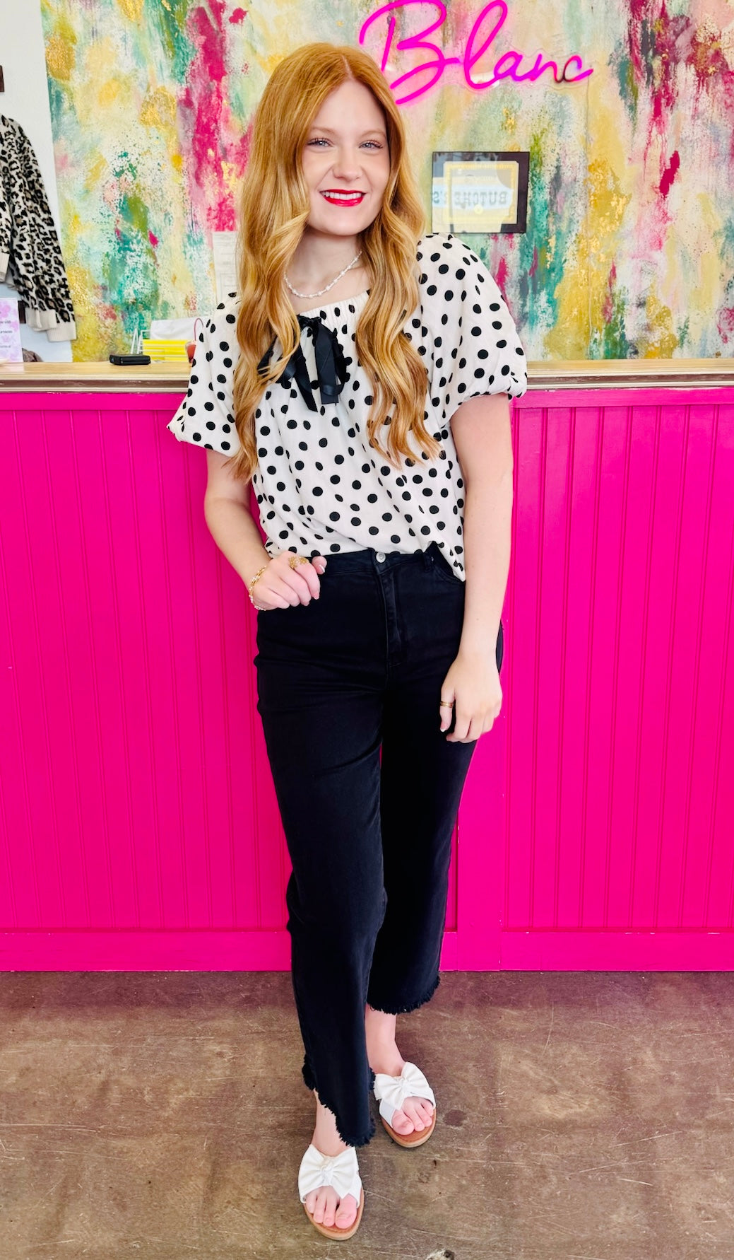 Soft details and playful texture make this puff sleeve top an instant favorite. Finished with polka dot bow accents and elastic sleeve openings, it brings an easy, feminine feel to everyday outfits.