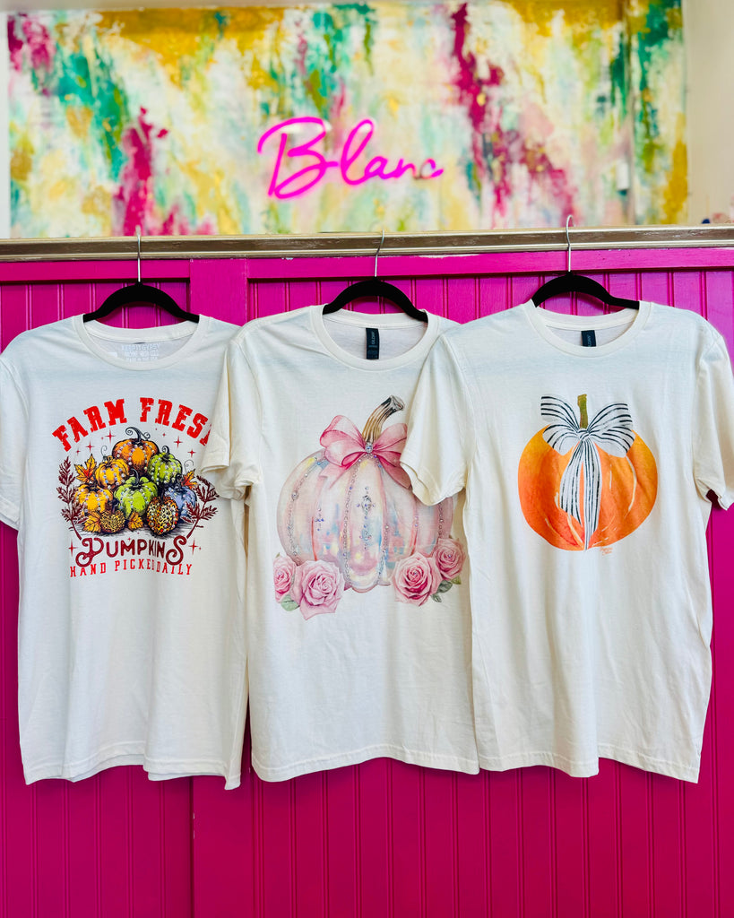 Straight from the patch and full of sparkle! This unisex cream tee features a bundle of colorful pumpkins (yes, even leopard print ones!) with rhinestone details for a little extra shine. The bold “Farm Fresh Pumpkins – Hand Picked Daily” graphic makes it a festive favorite for fall days at the market, pumpkin patch, or football game.