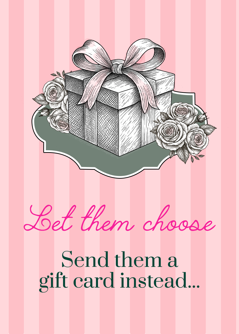 Gift cards are delivered by email and contain instructions to redeem them at checkout. Our gift cards have no additional processing fees.